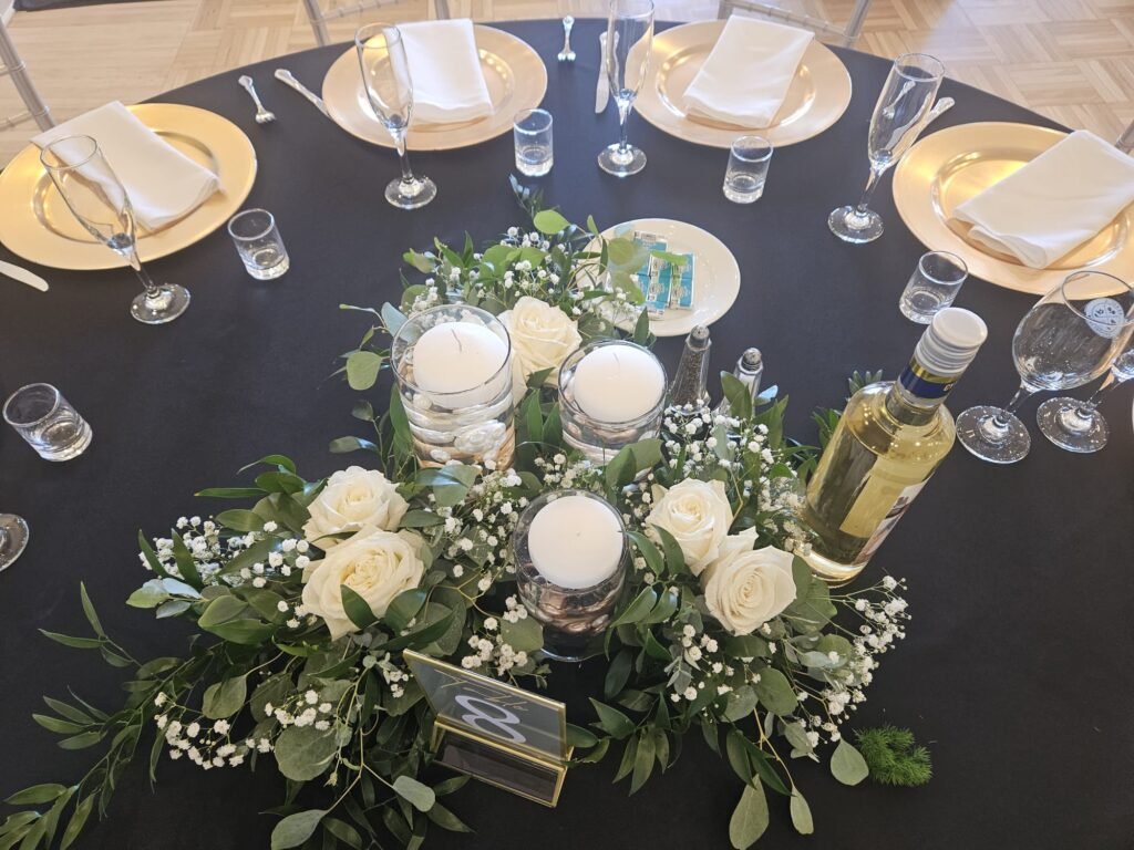 Wedding or other catered event setting, flowers, candles, white plates, blue napkins, wooden tables, Event decoration, outdoors, summer time