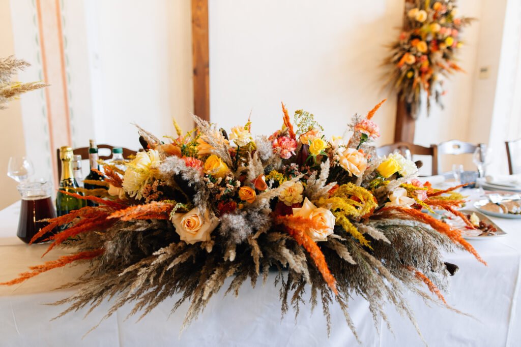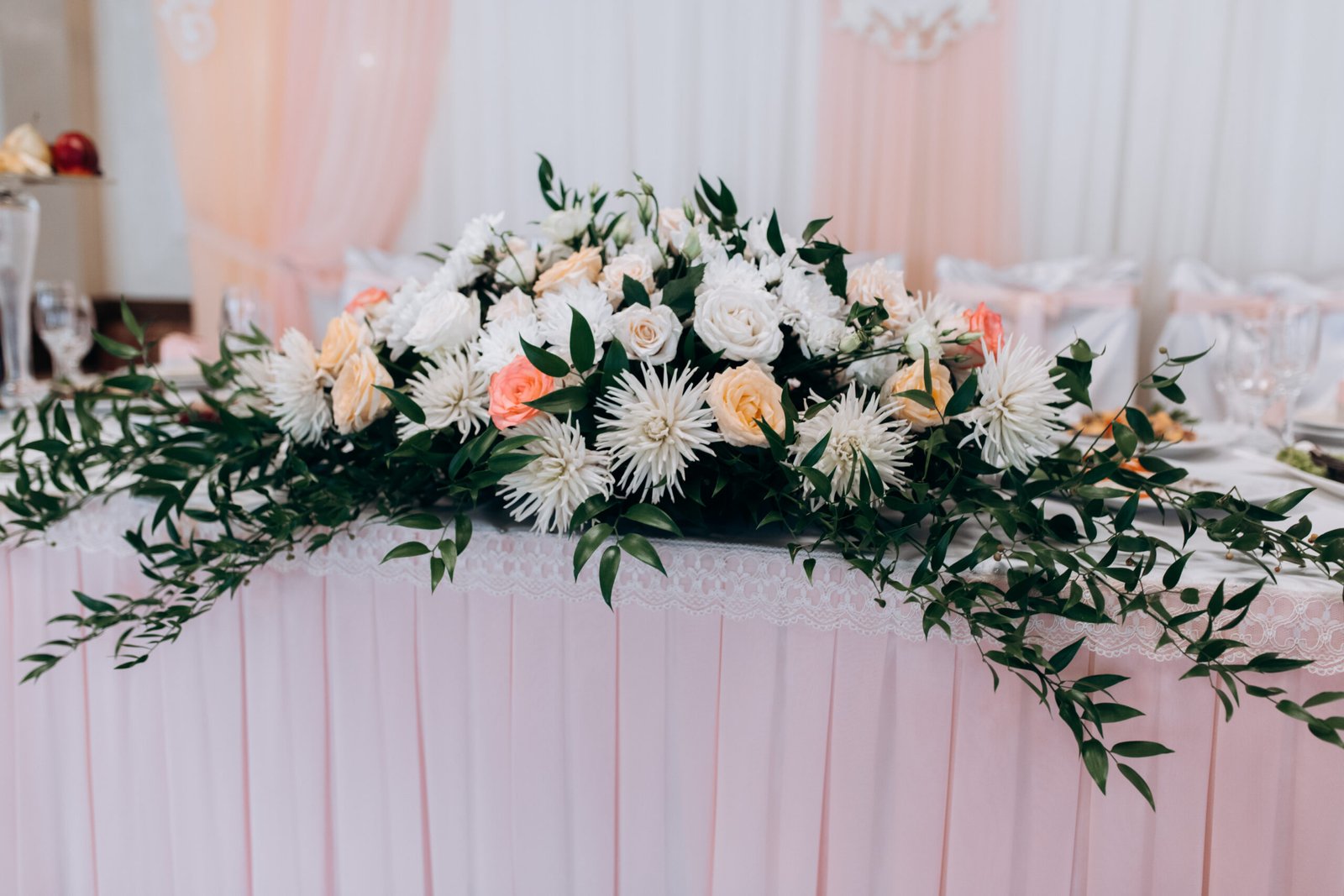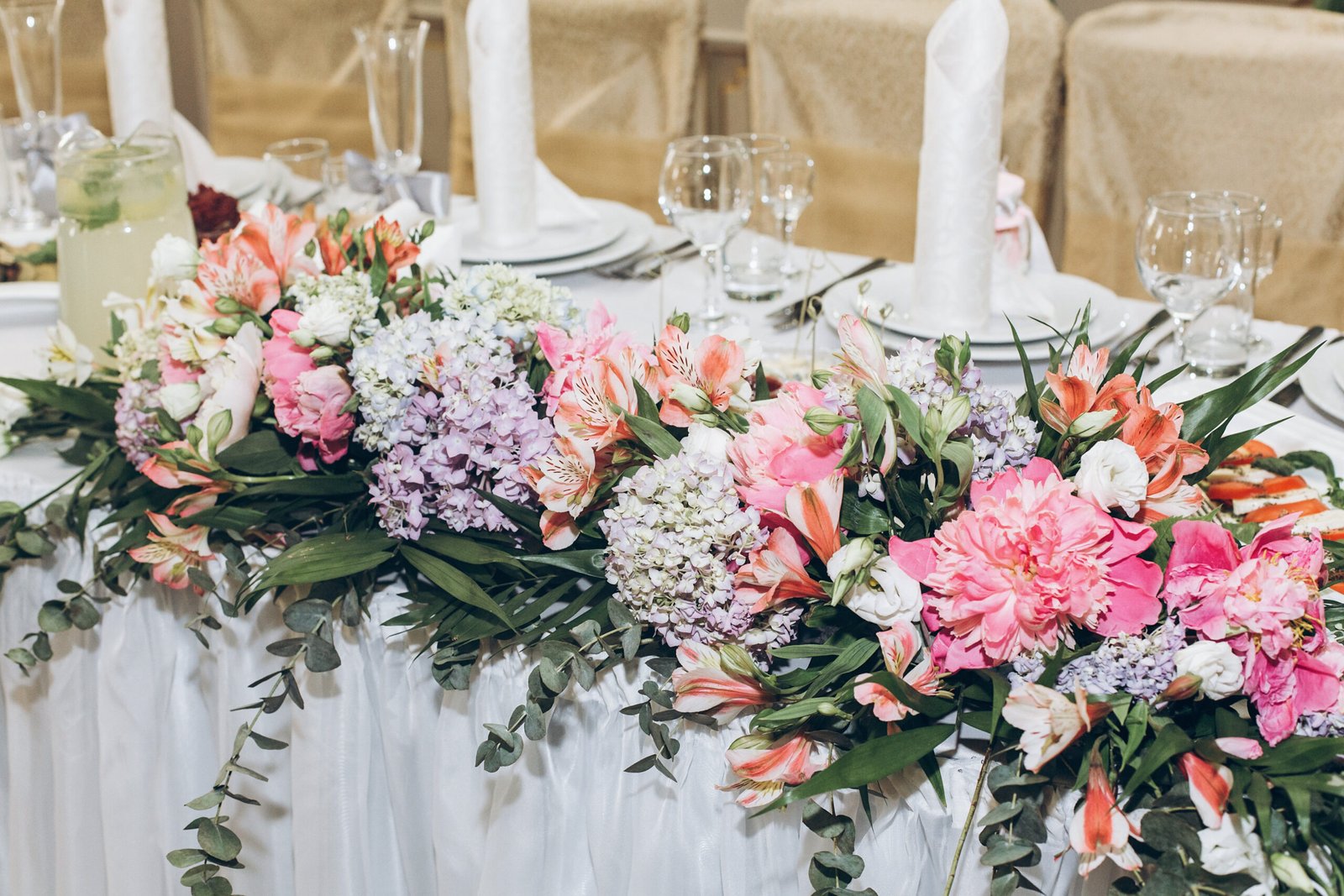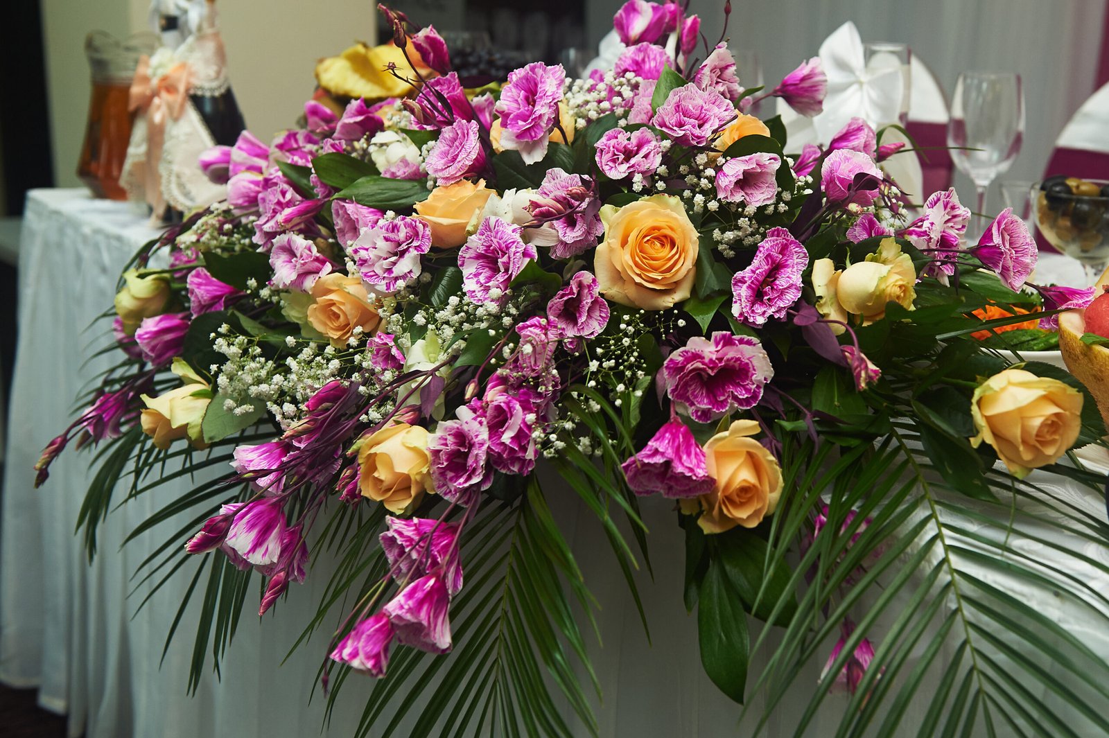 Wedding arrangement on the table of the newlyweds. Yellow-pink flowers. Floral