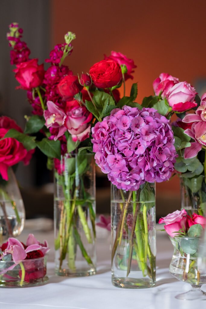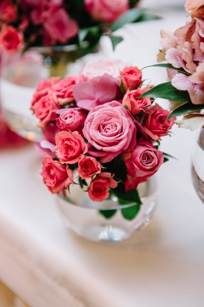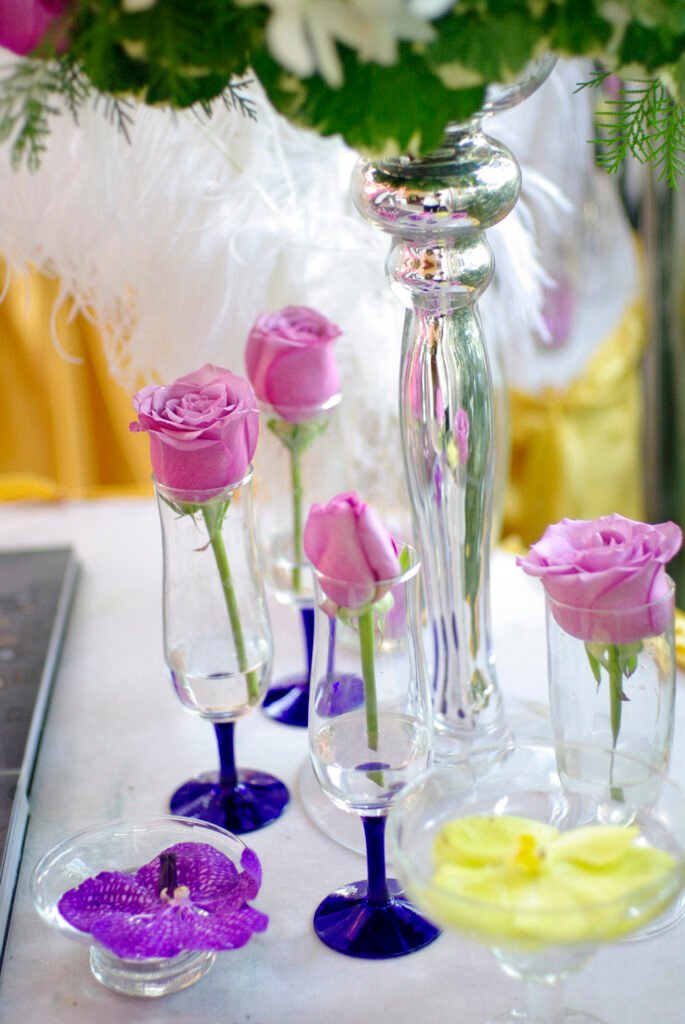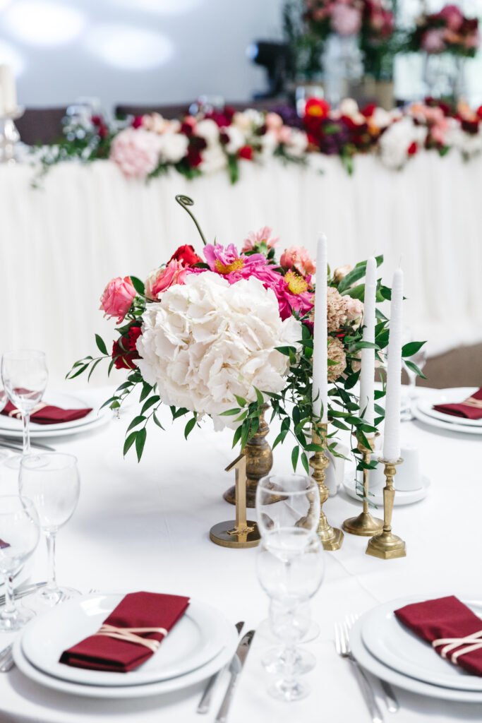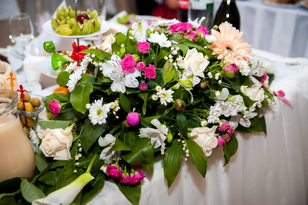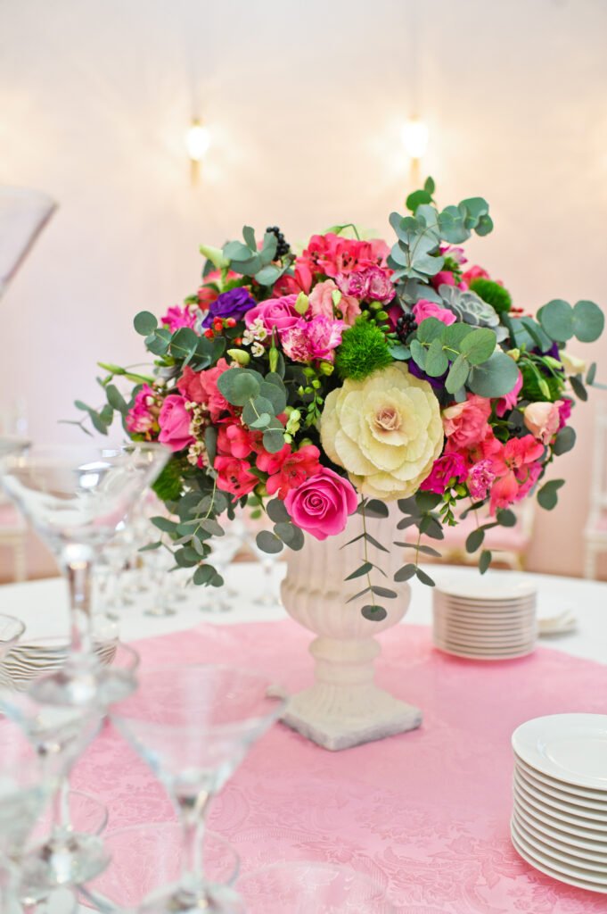 Wedding flowers concept. . Bright colors. Table decorations. Closeup.