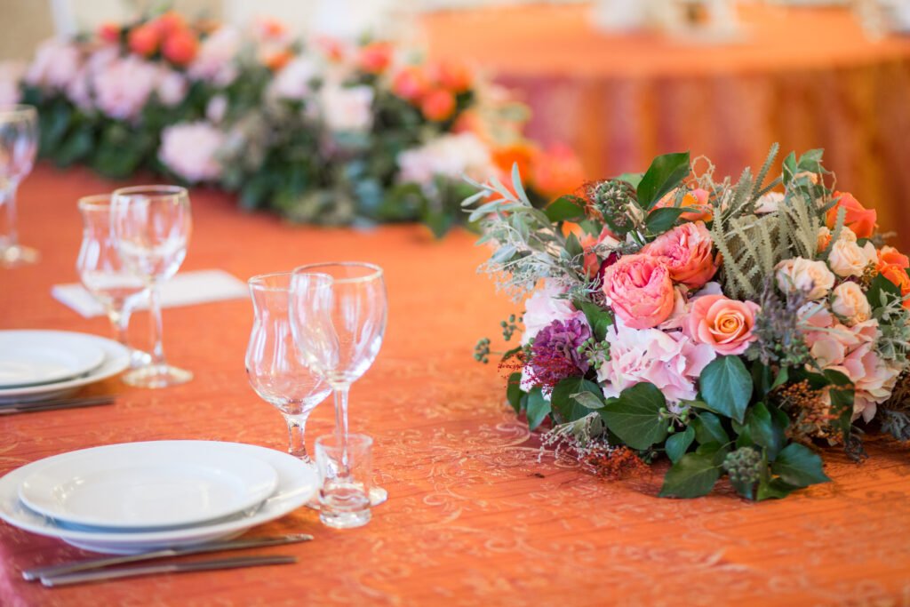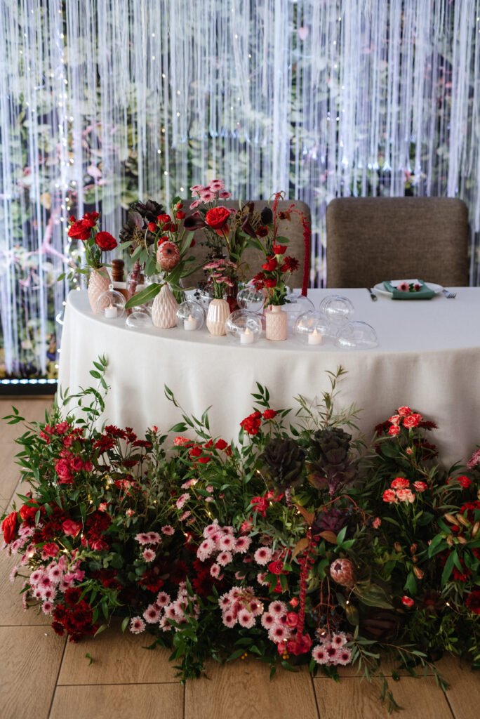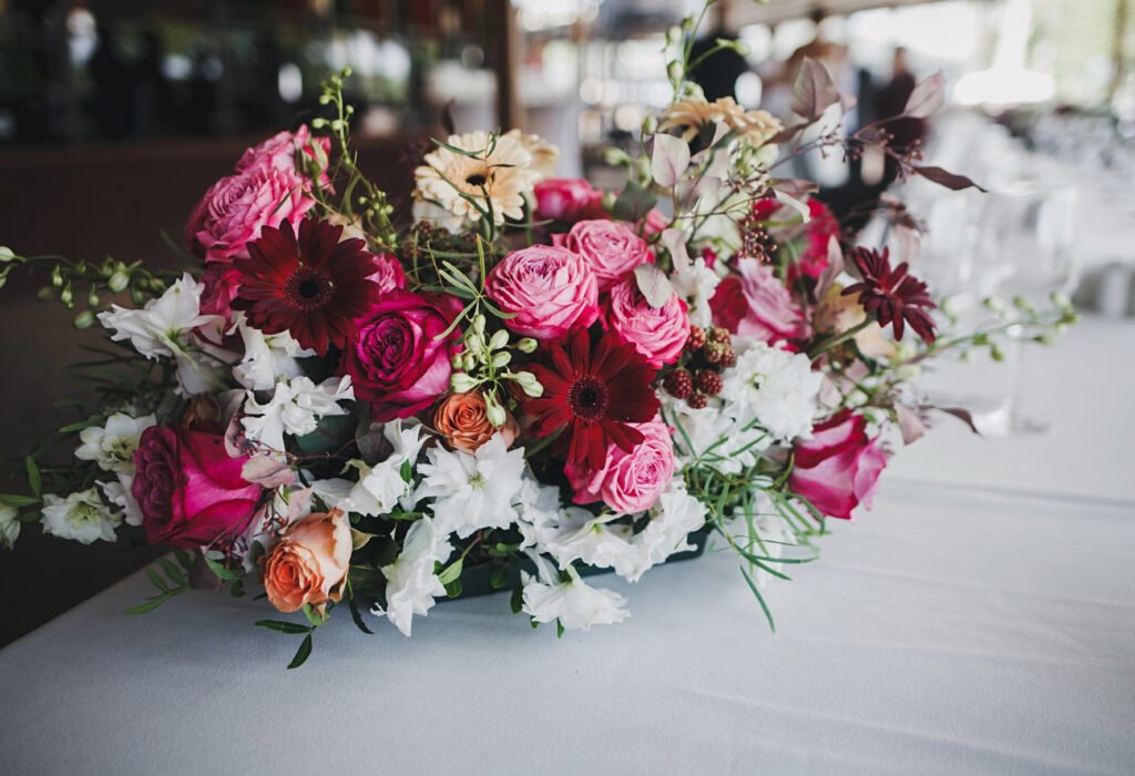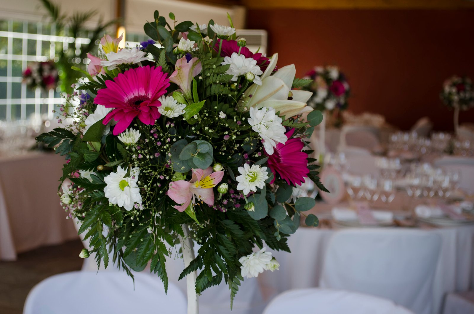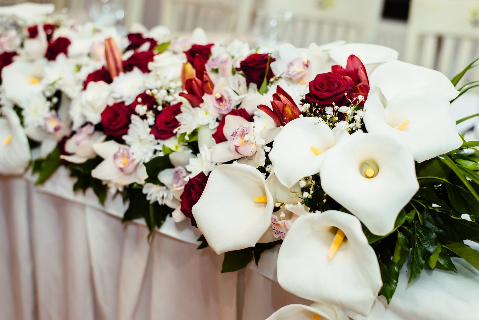 Wedding flowers concept. . Bright colors. Table decorations. Closeup.