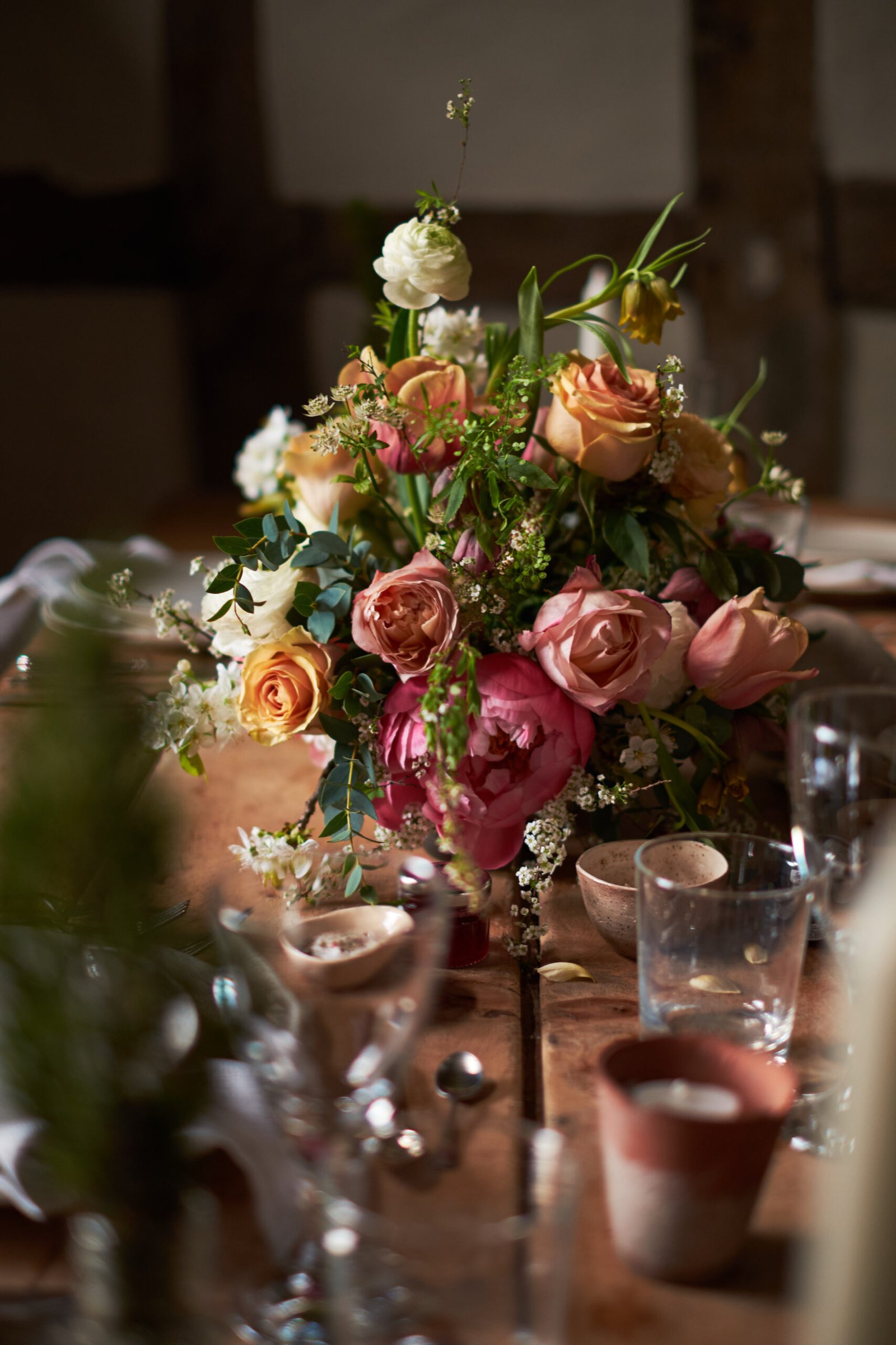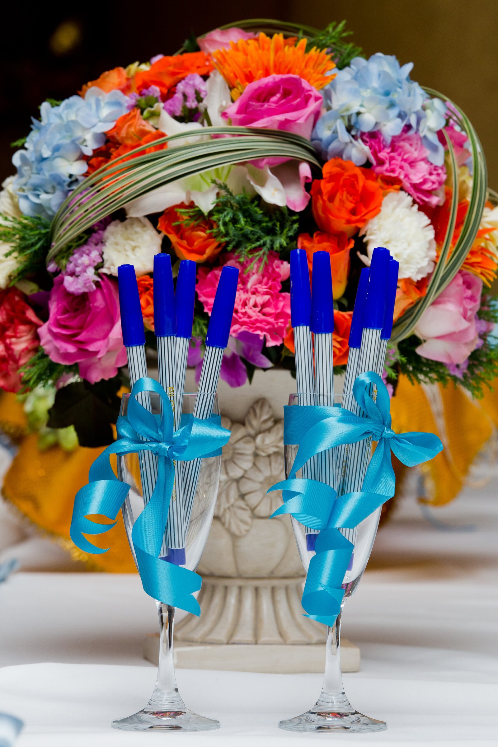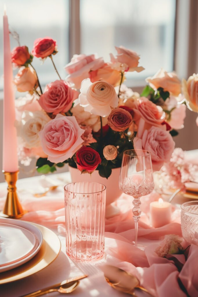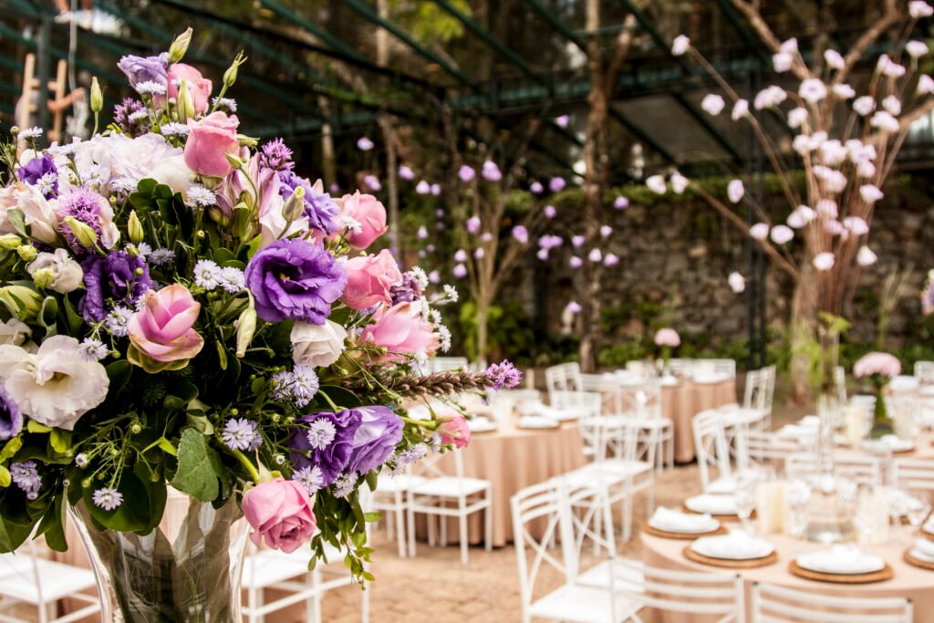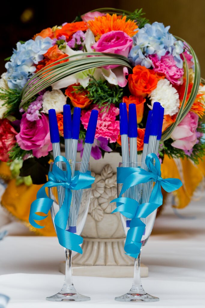 Wedding flowers concept. . Bright colors. Table decorations. Closeup.