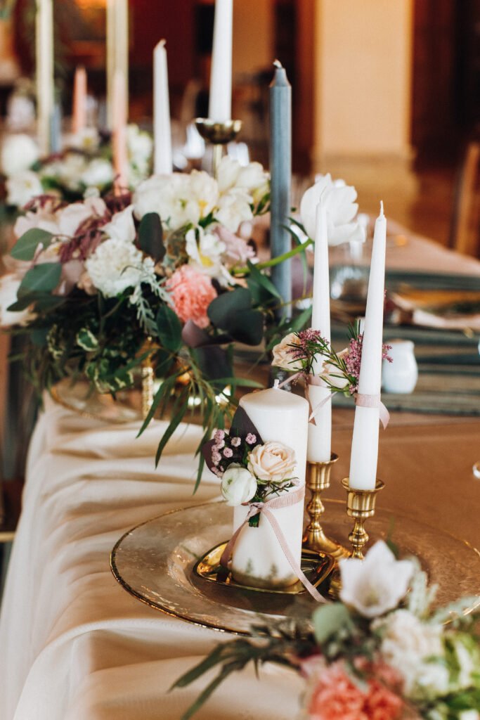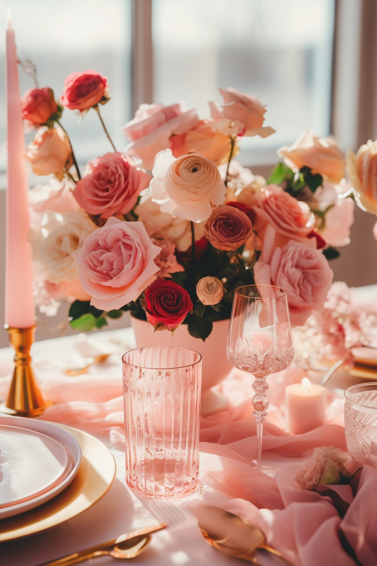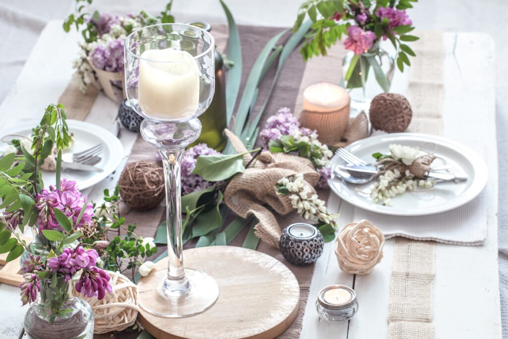 Beautifully elegant decorated table for holiday with spring flowers and greens – wedding or valentine day with modern cutlery, bow, glass, candle and gift, horizontal, closeup, toned