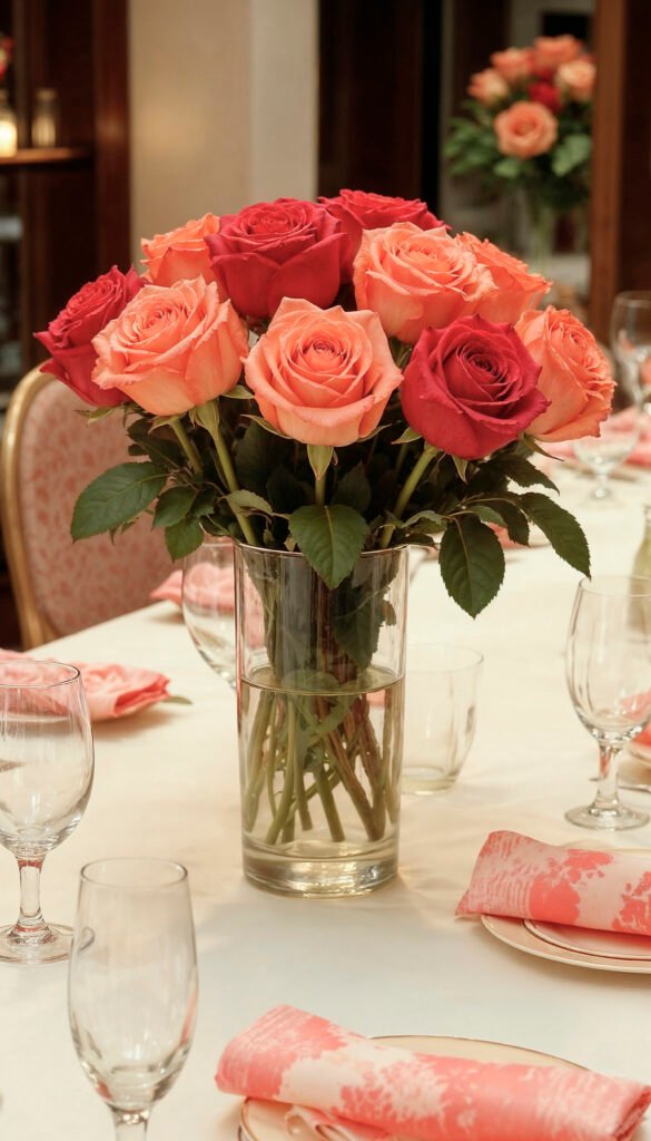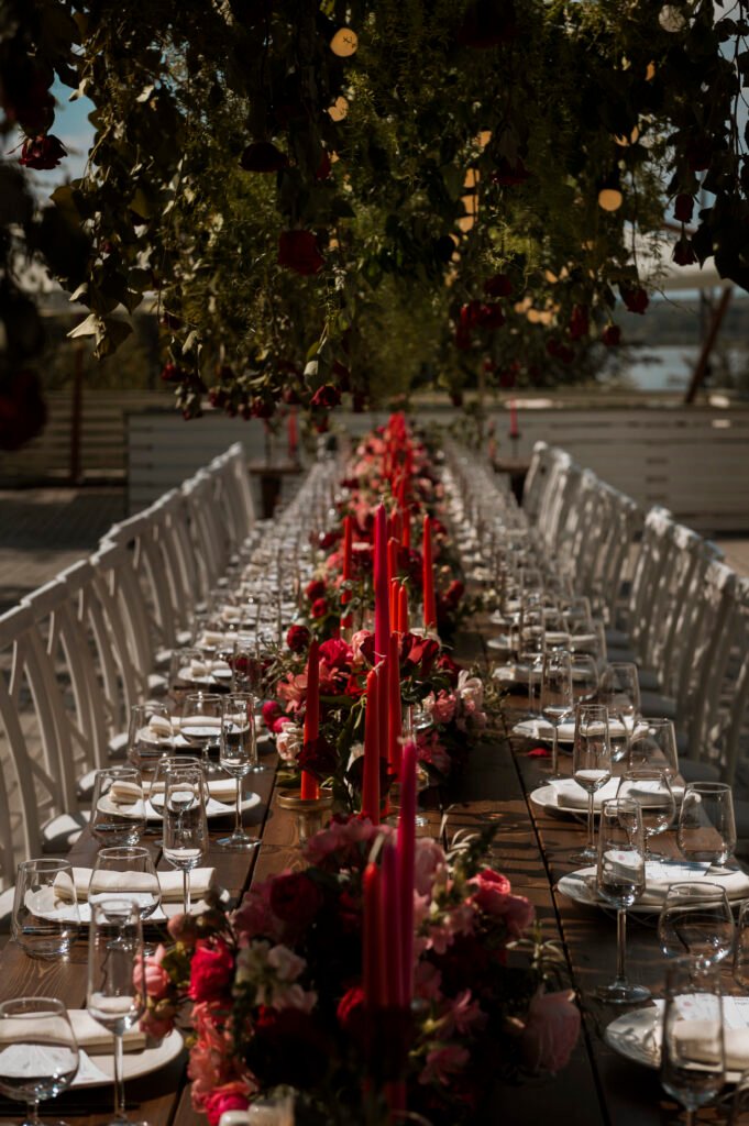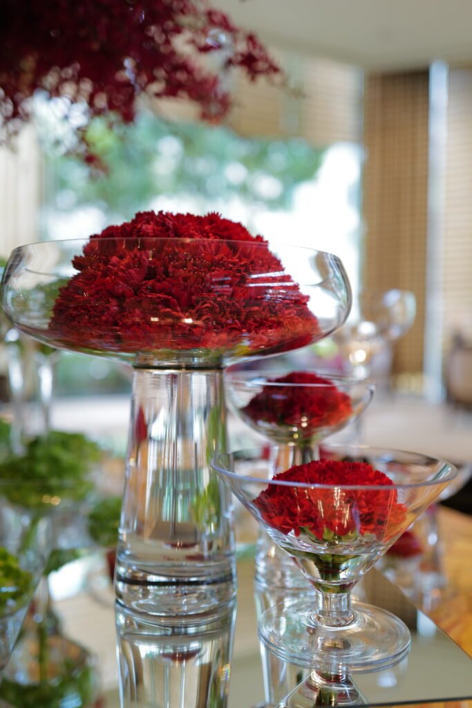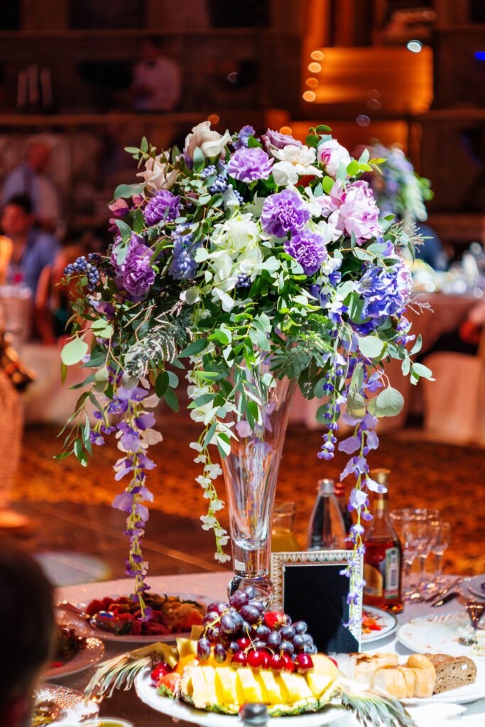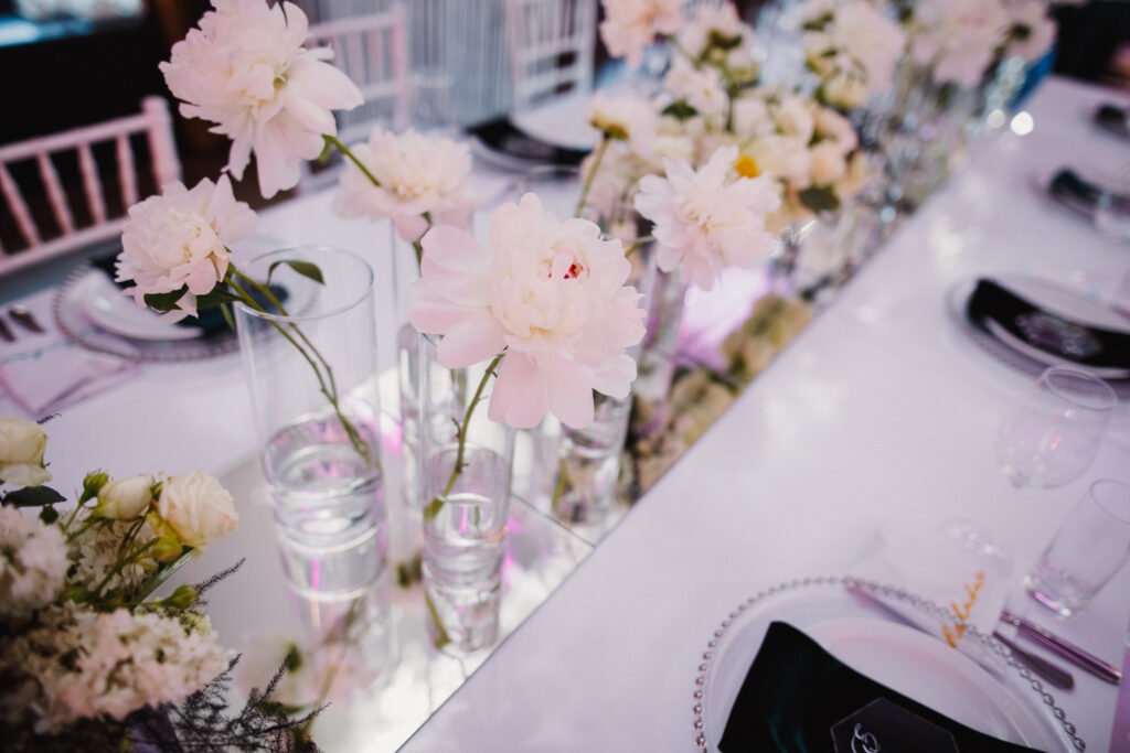 Table set for wedding banquet with floral composition of decorative dianthus. Flower decoration in tall vase.