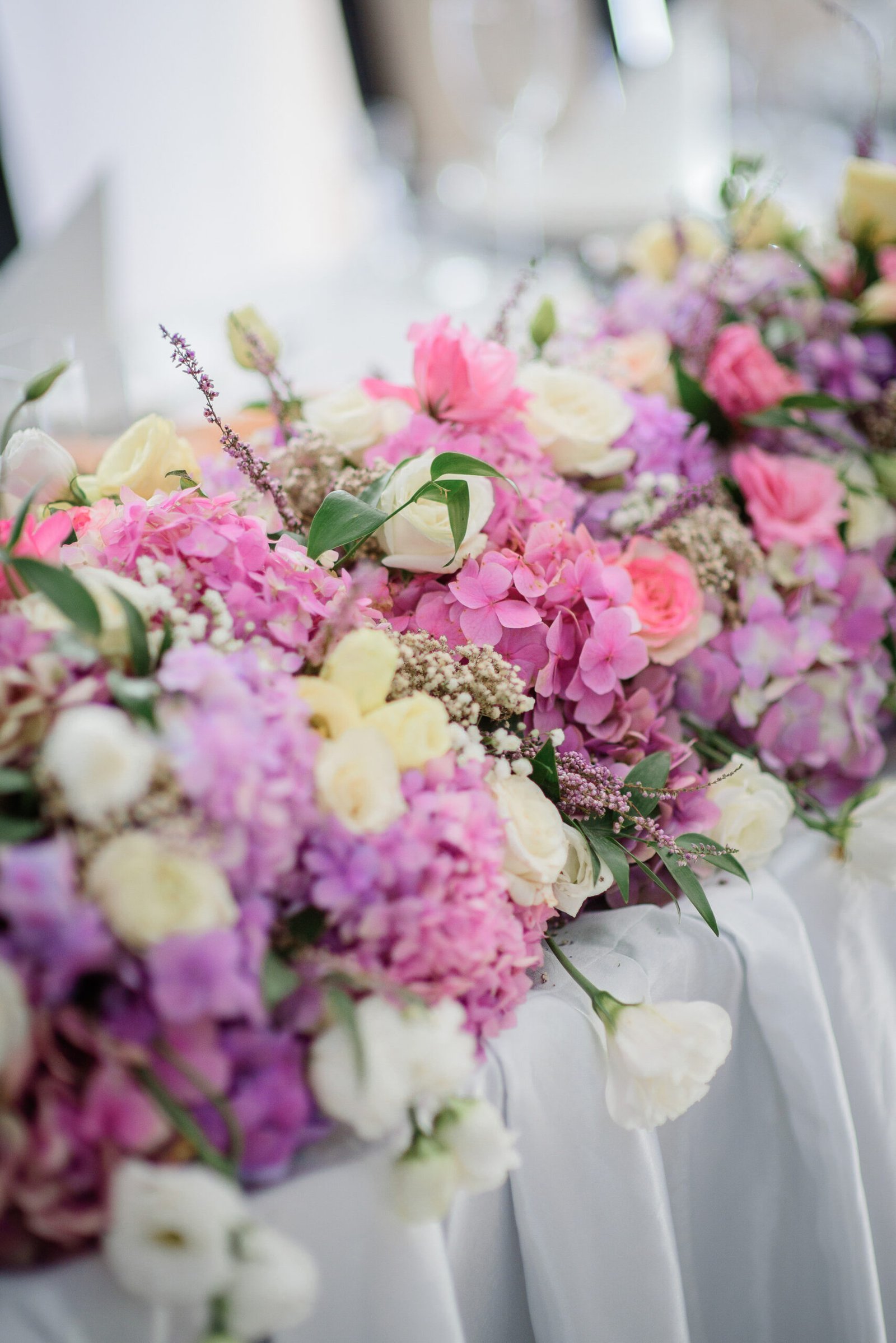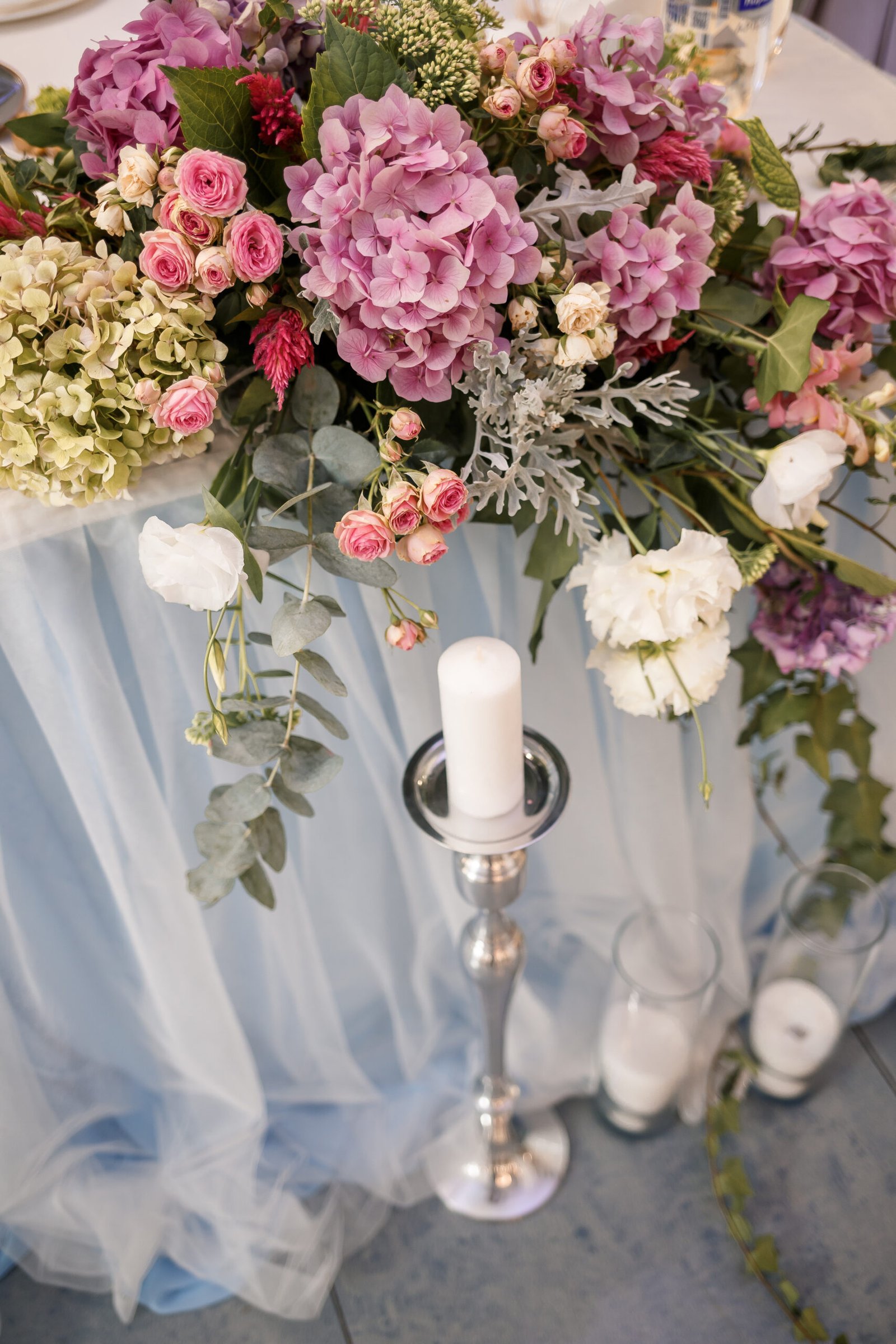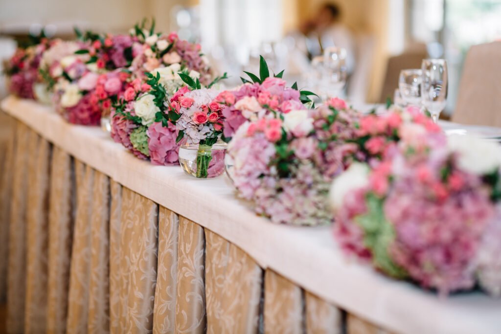 Garland of pink hydrangeas and white roses lies on long dinner table