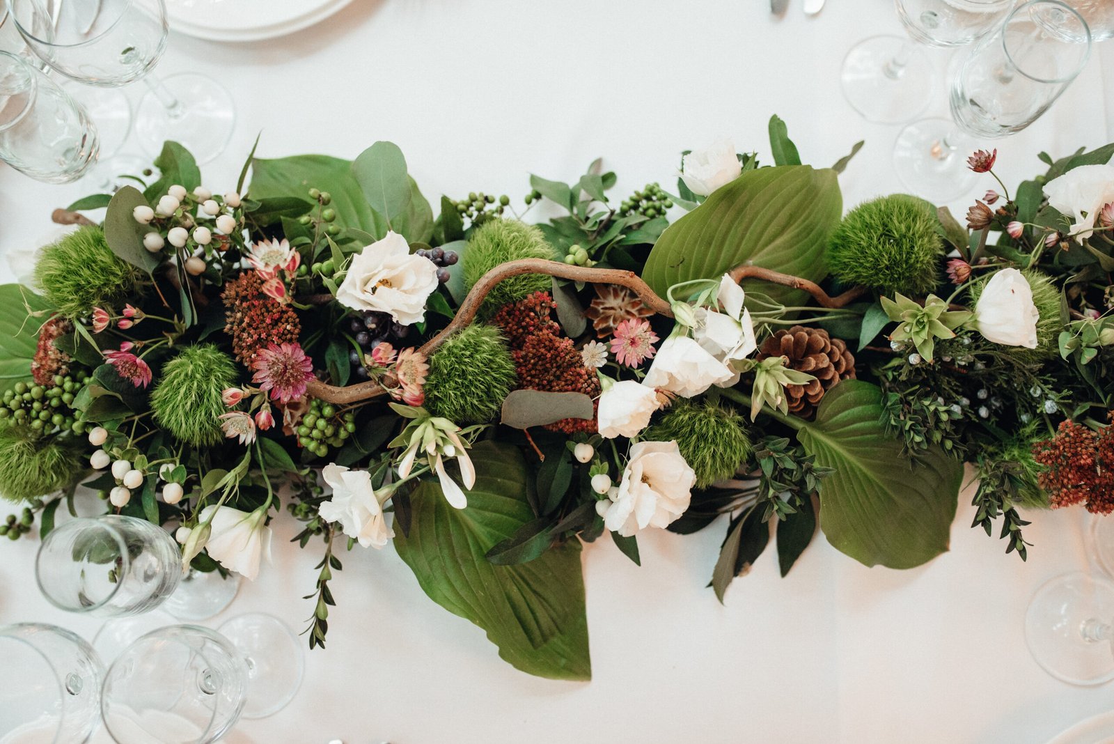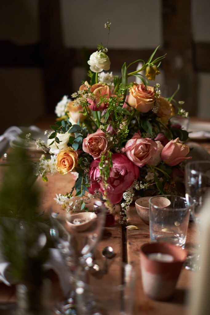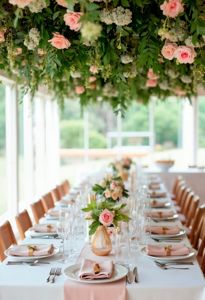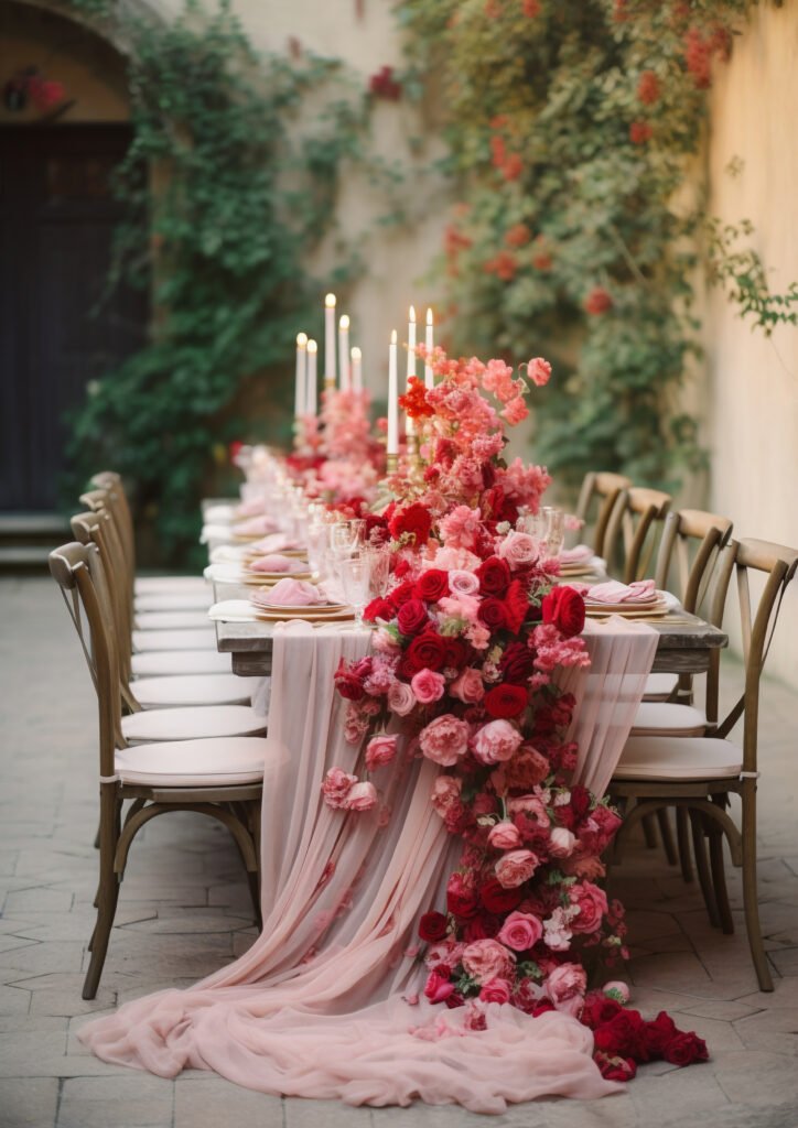 Garland of pink hydrangeas and white roses lies on long dinner table