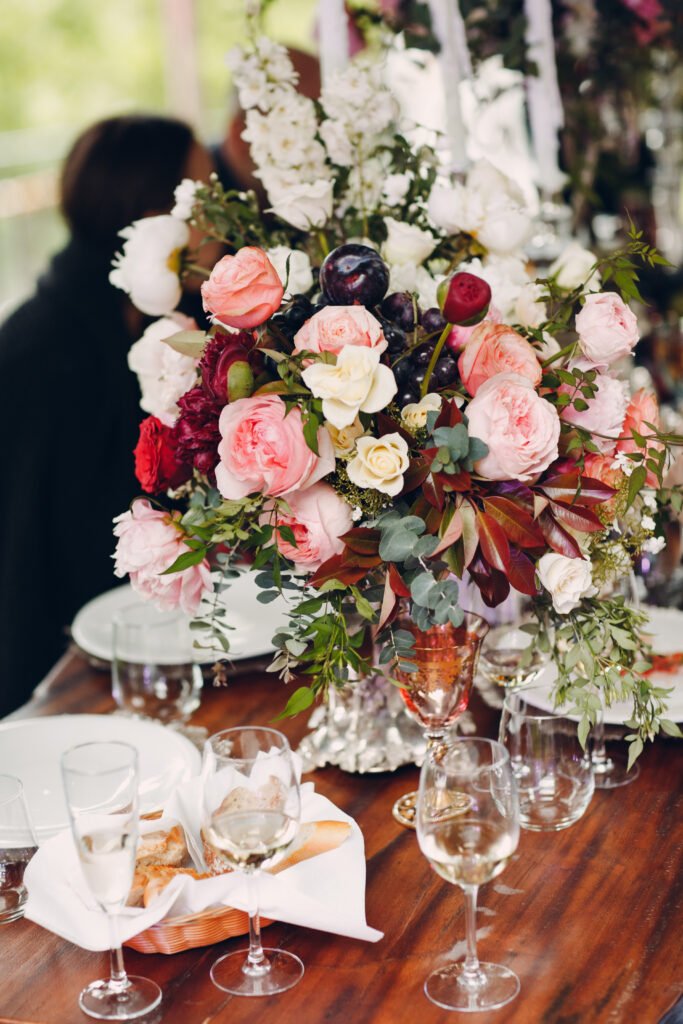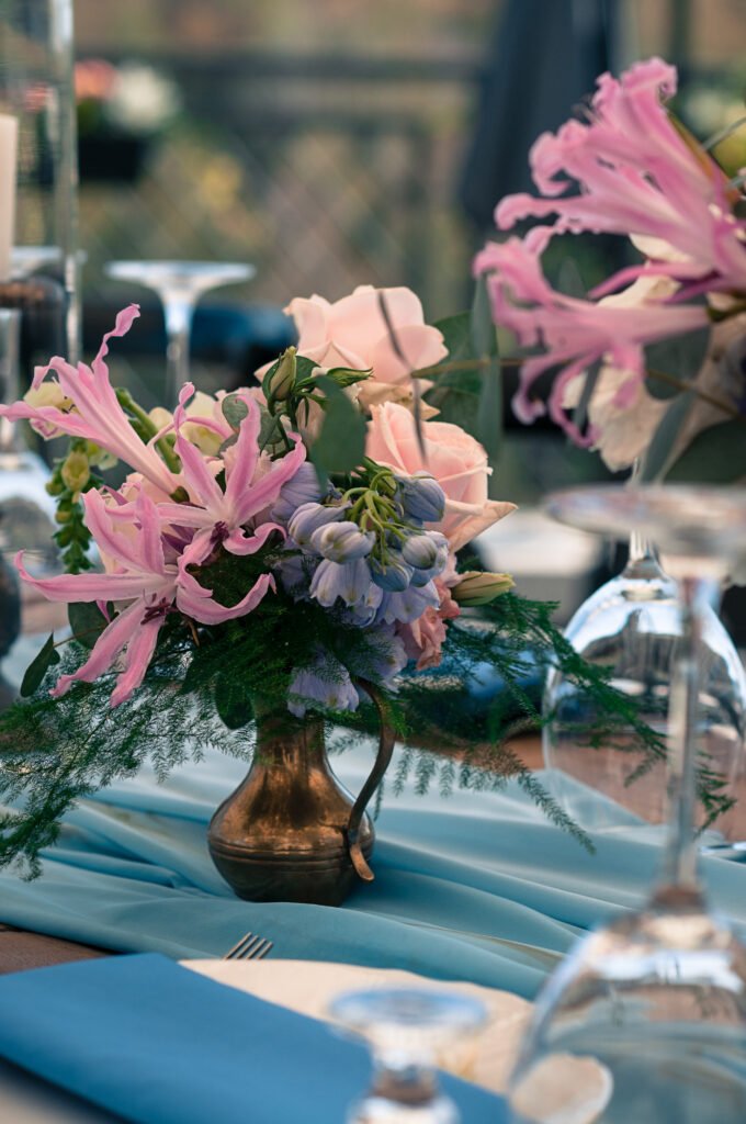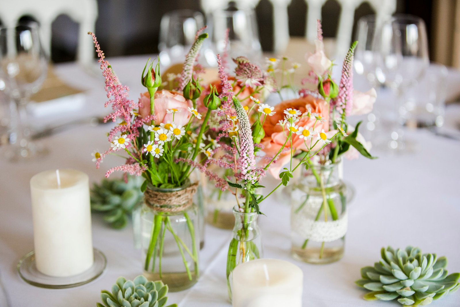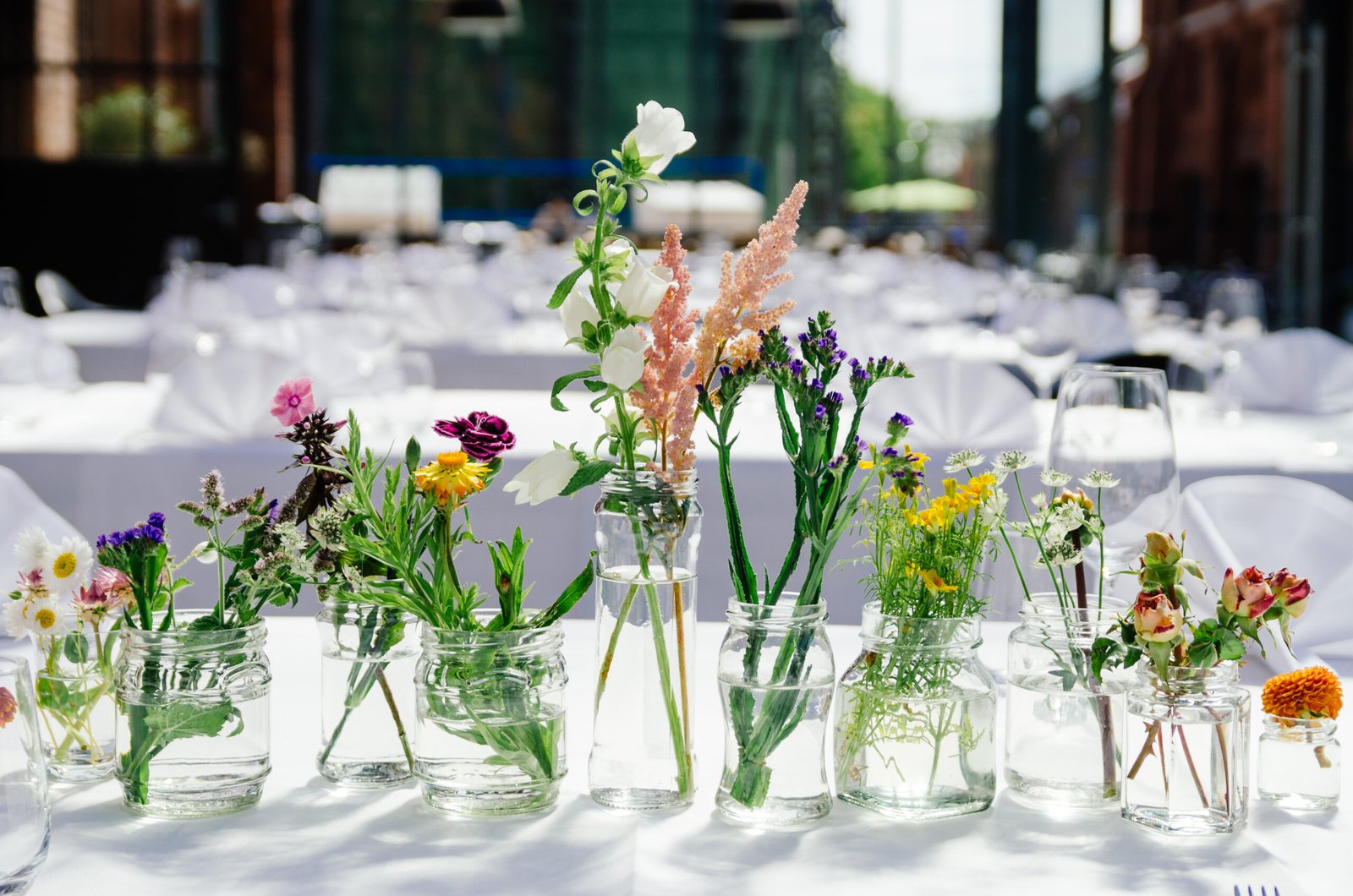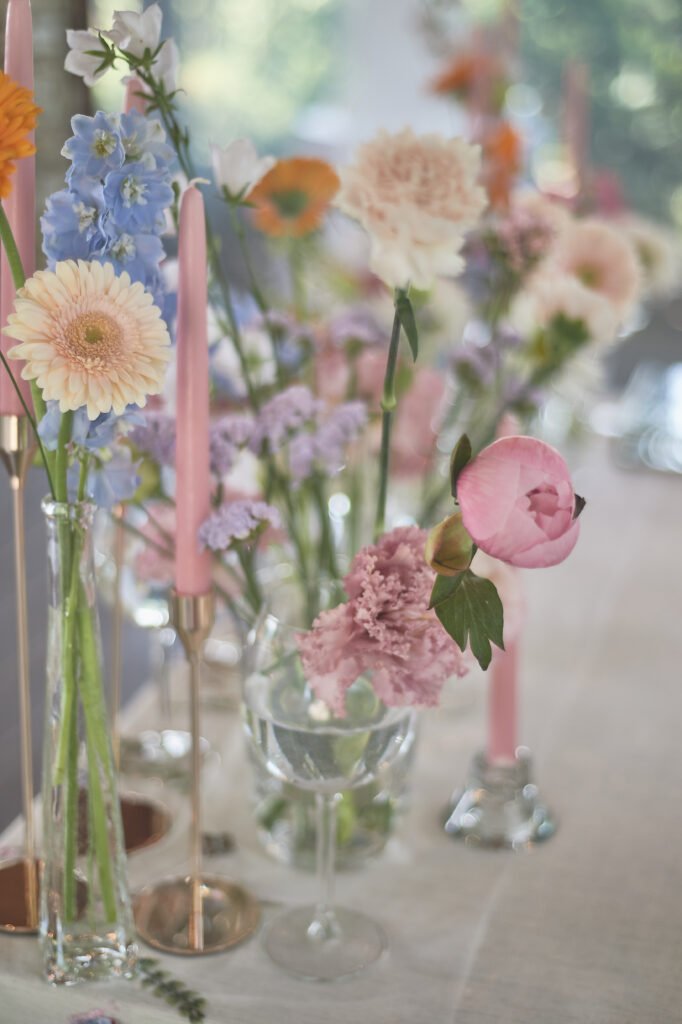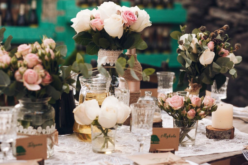Bouquets of fresh flowers decoration of the festive table. Celebrating an open air party. Decor Details.