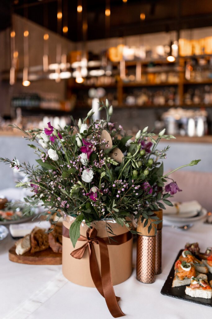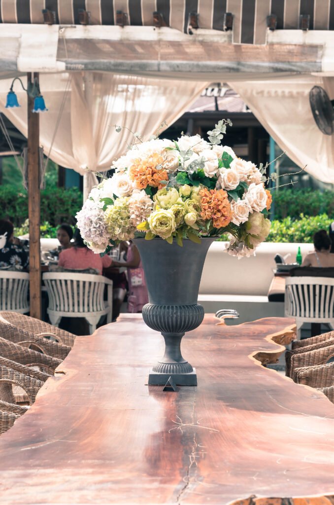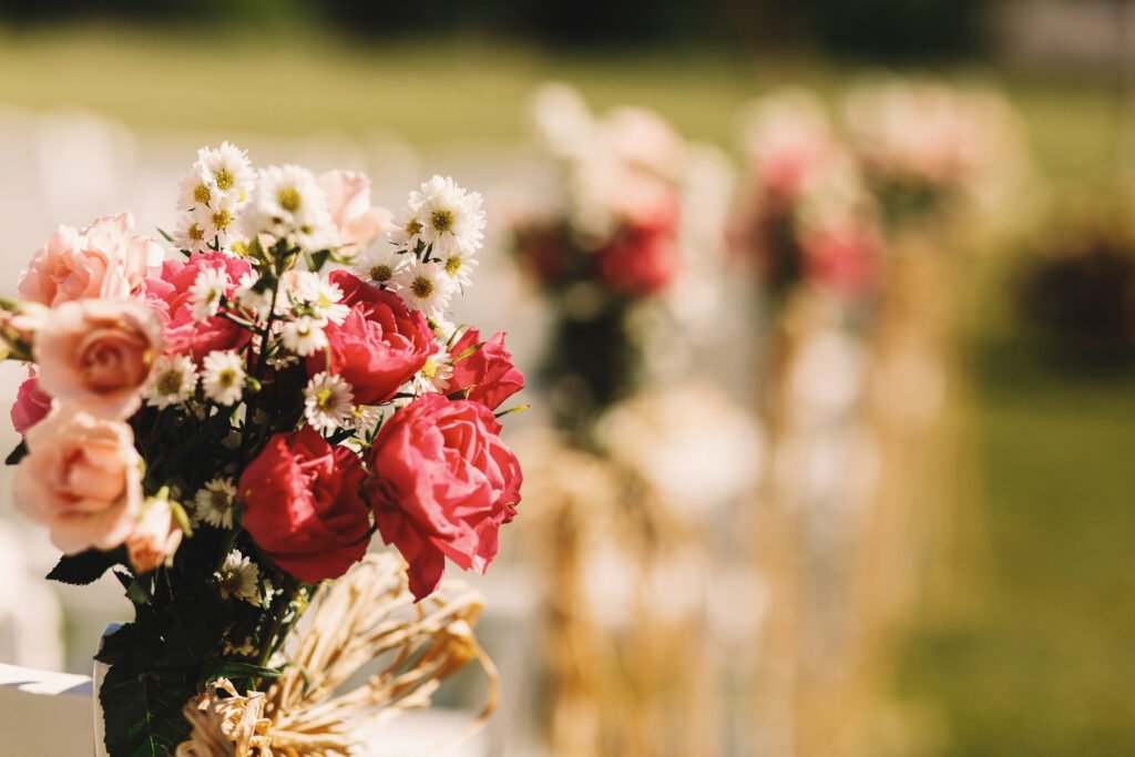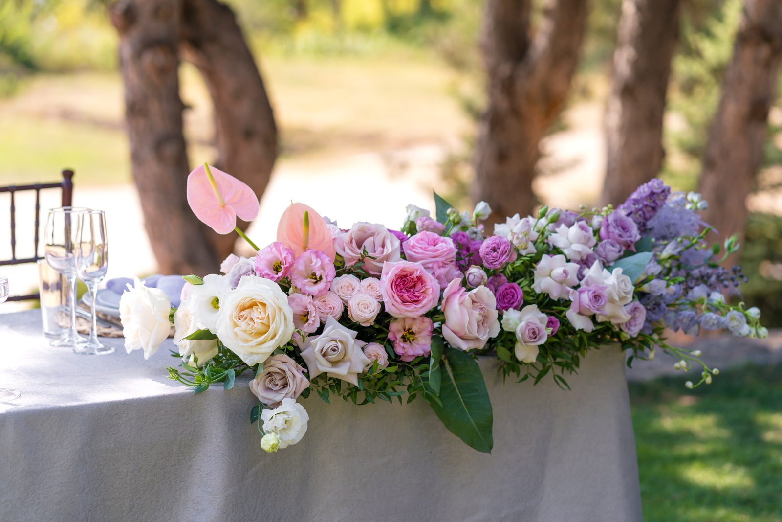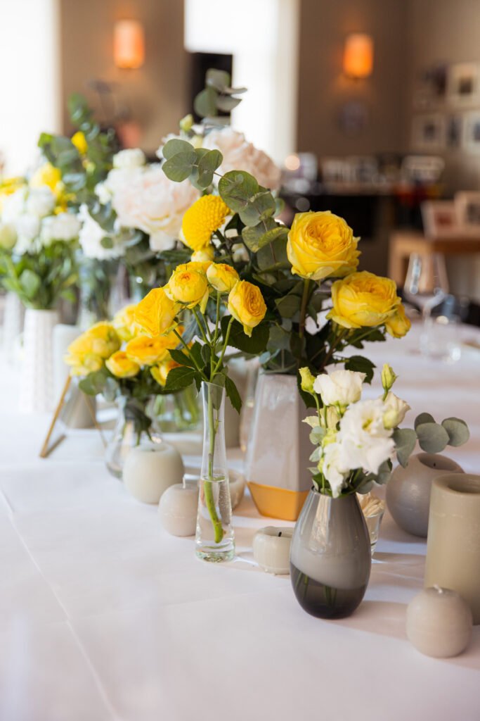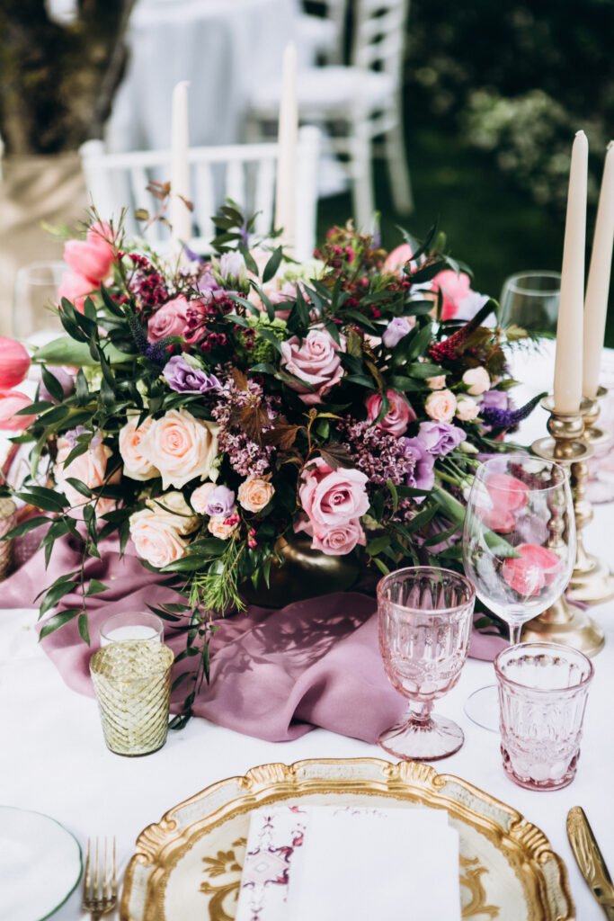 Bouquets of fresh flowers decoration of the festive table. Celebrating an open air party. Decor Details.