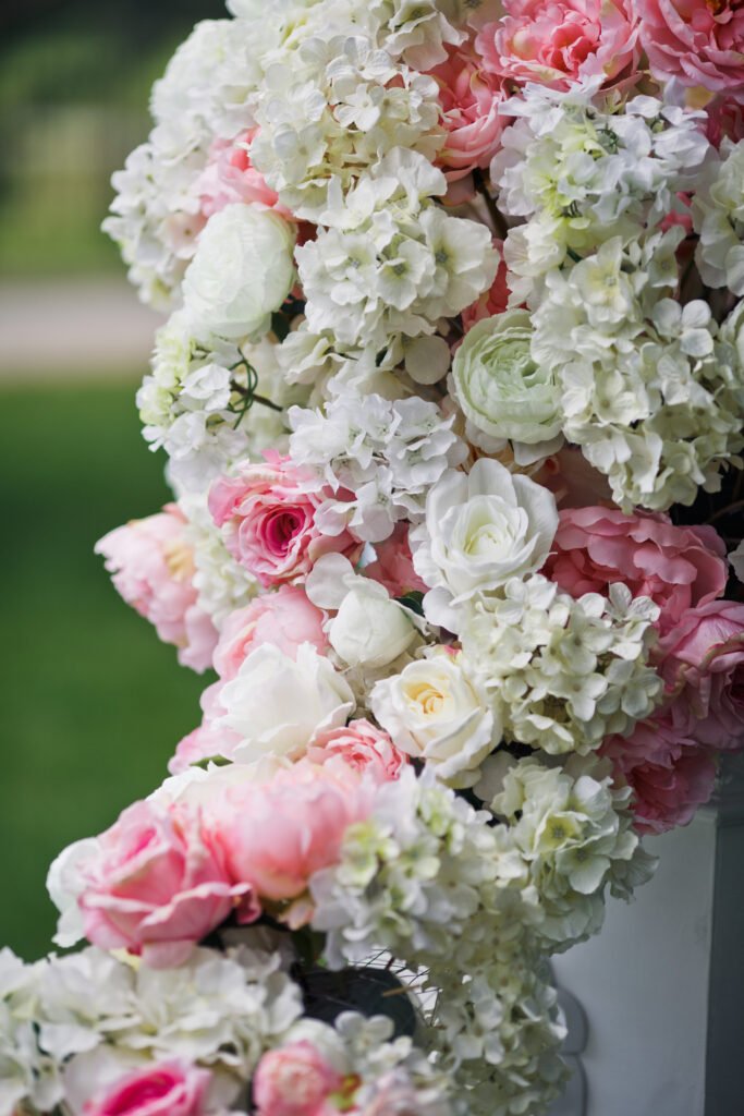 Garland of blue hydrangeas and pink roses hangs on steel wedding altar