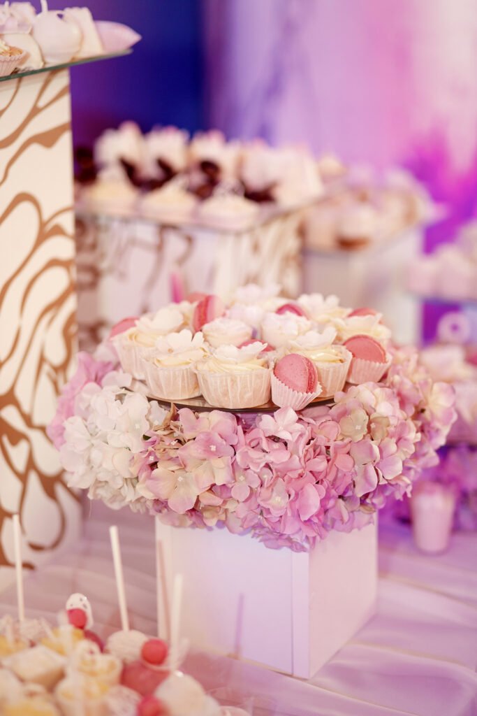 Plates with pink and white sweets stand on cubes with hydrangeas
