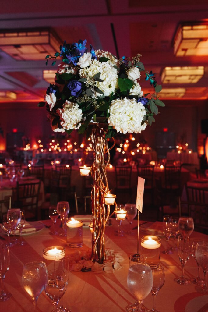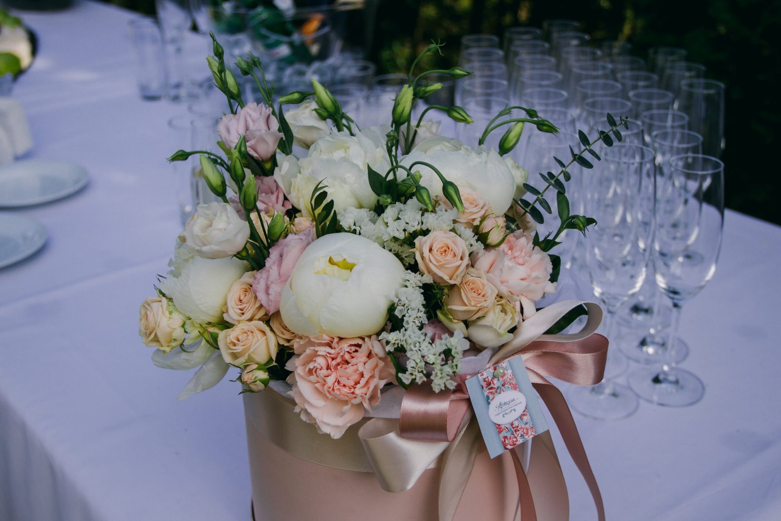 flower centerpiece bouquet with eustomas and hydrangeas in the glass vase