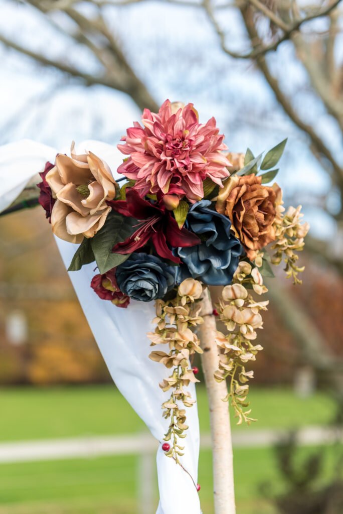 Wedding decor made of flowers and fabric. Beautiful decorations for newlyweds on their wedding day