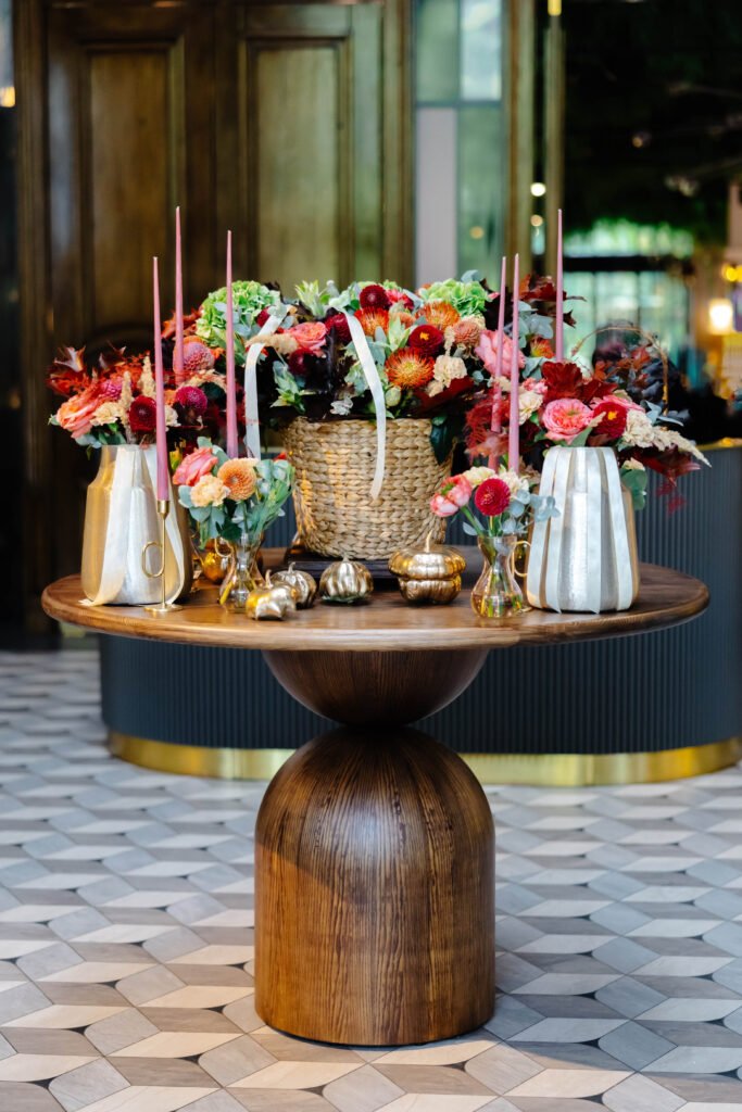Colorful autumn flowers, candles and pumpkins decorating a wooden table in a modern hotel lobby, creating a welcoming atmosphere