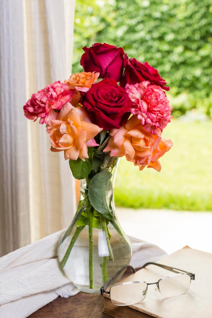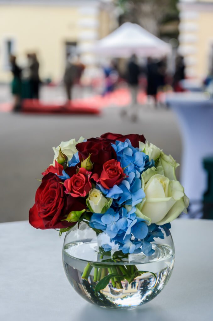 Beautiful fresh bright bouquet of blue hydrangeas, red and cream roses in a glass round vase on a white table. Beautiful floral composition. A solemn bouquet decoration for the holiday