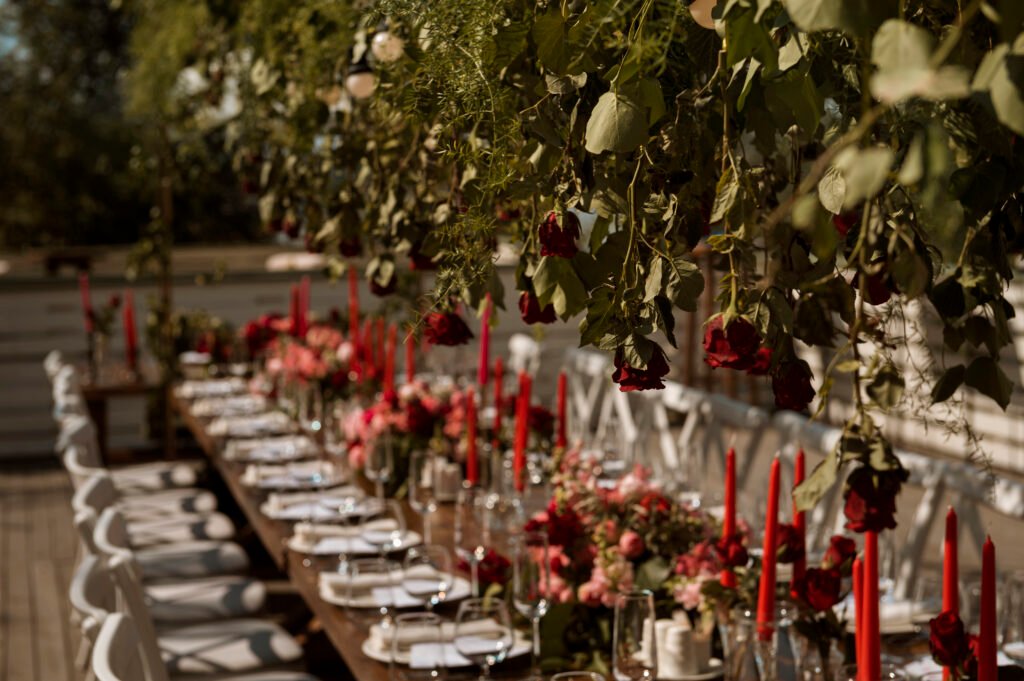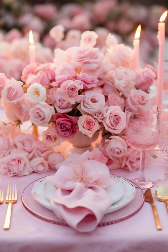 Yellow light garlands hang over the dinner tables decorated with pink bouquets