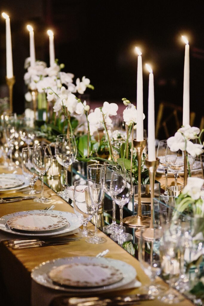 Table set at the wedding Banquet in the restaurant, classic style with white tablecloths and napkins, vases with flowers