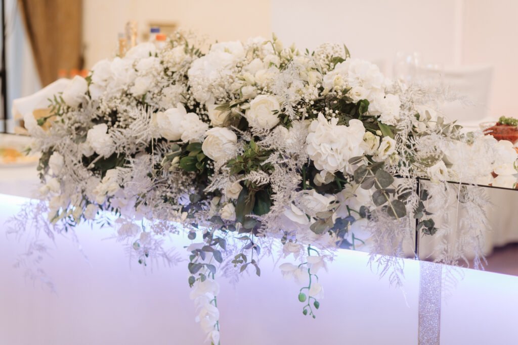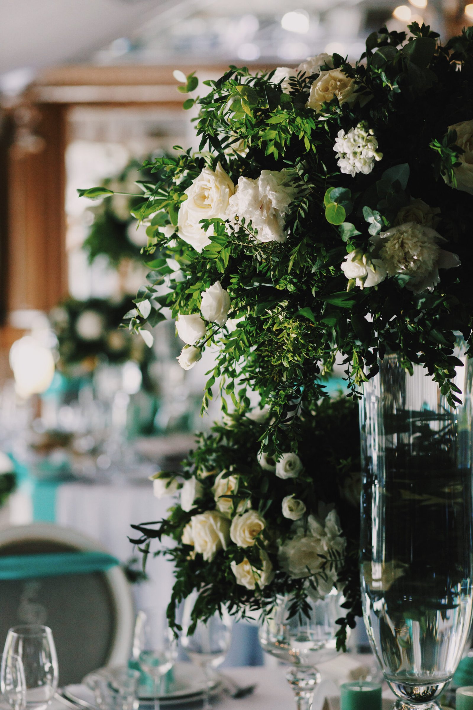 Bouquet of white roses stands in the middle of dinner table in the restaurant