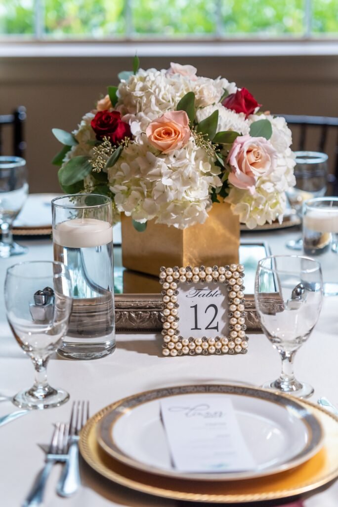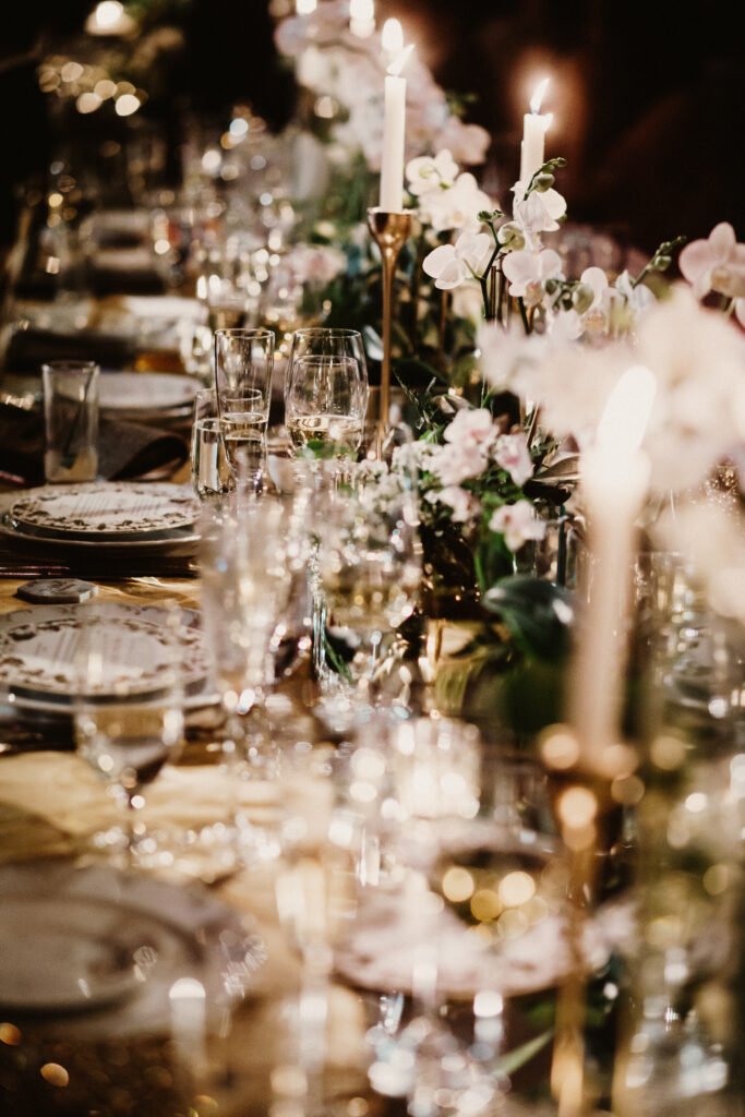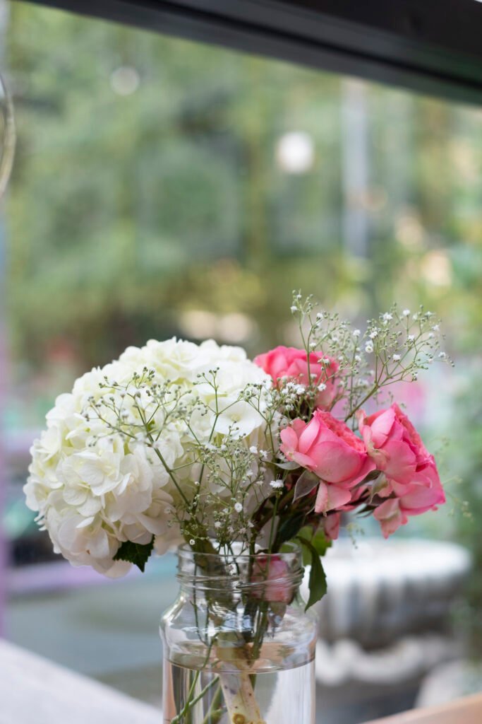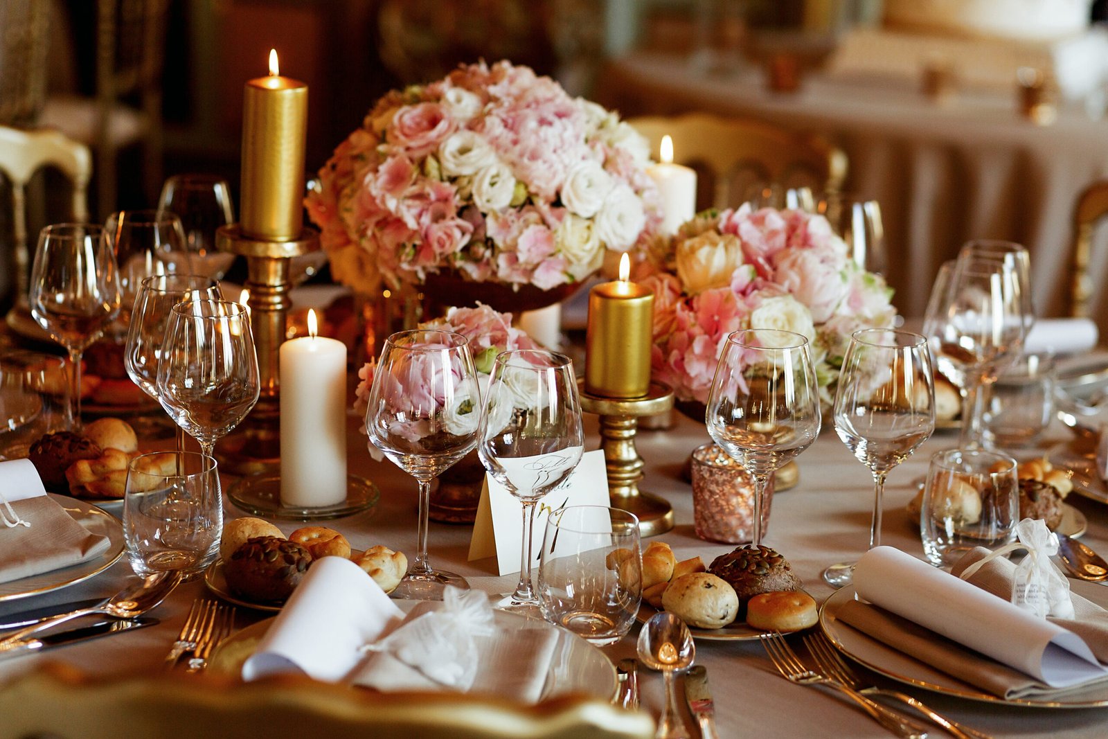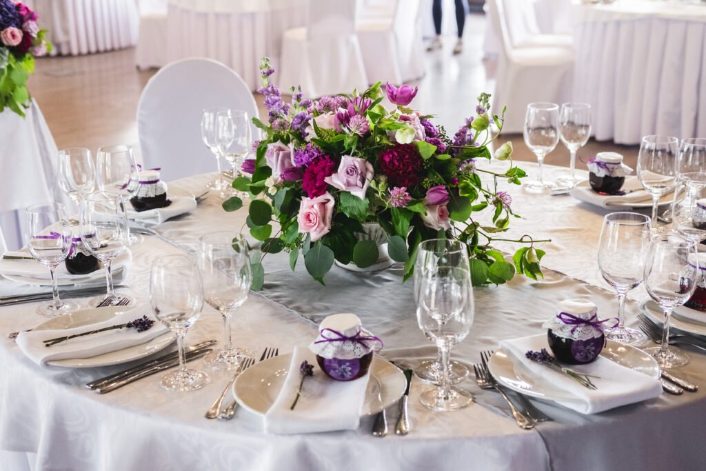 Tender hydrangea centerpiece and wine glasses on blurred background