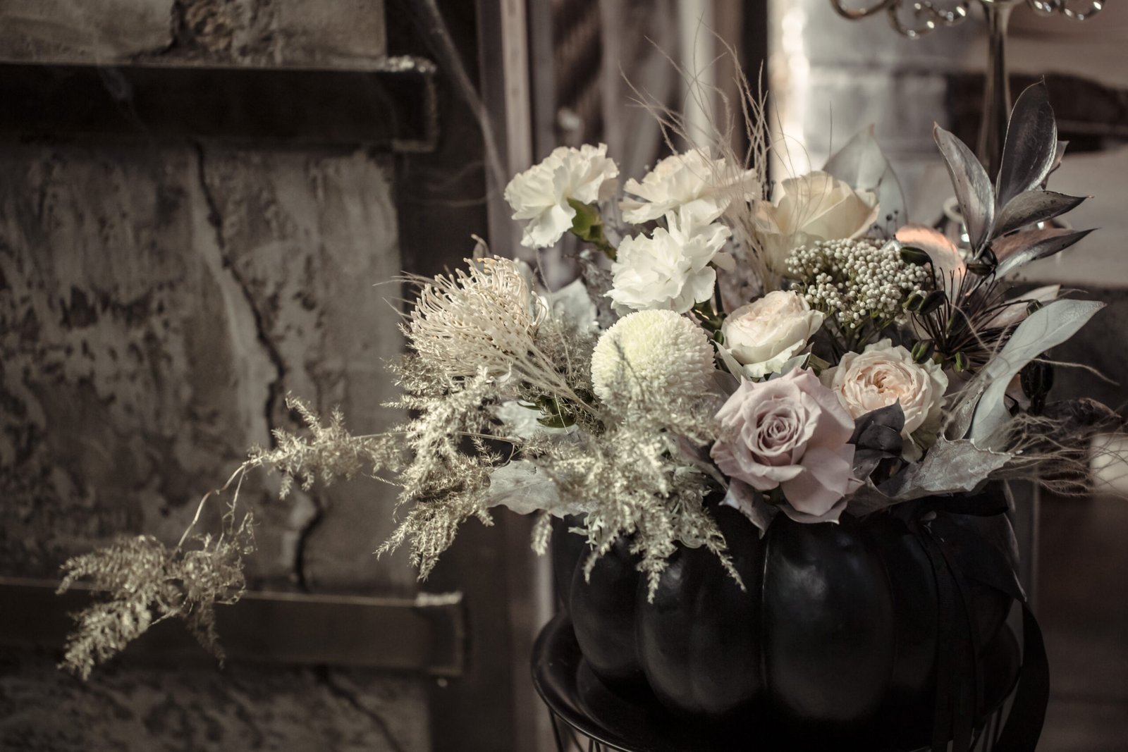 Floral arrangement of fresh flowers in black pumpkin. The concept of autumn holidays. Halloween’s