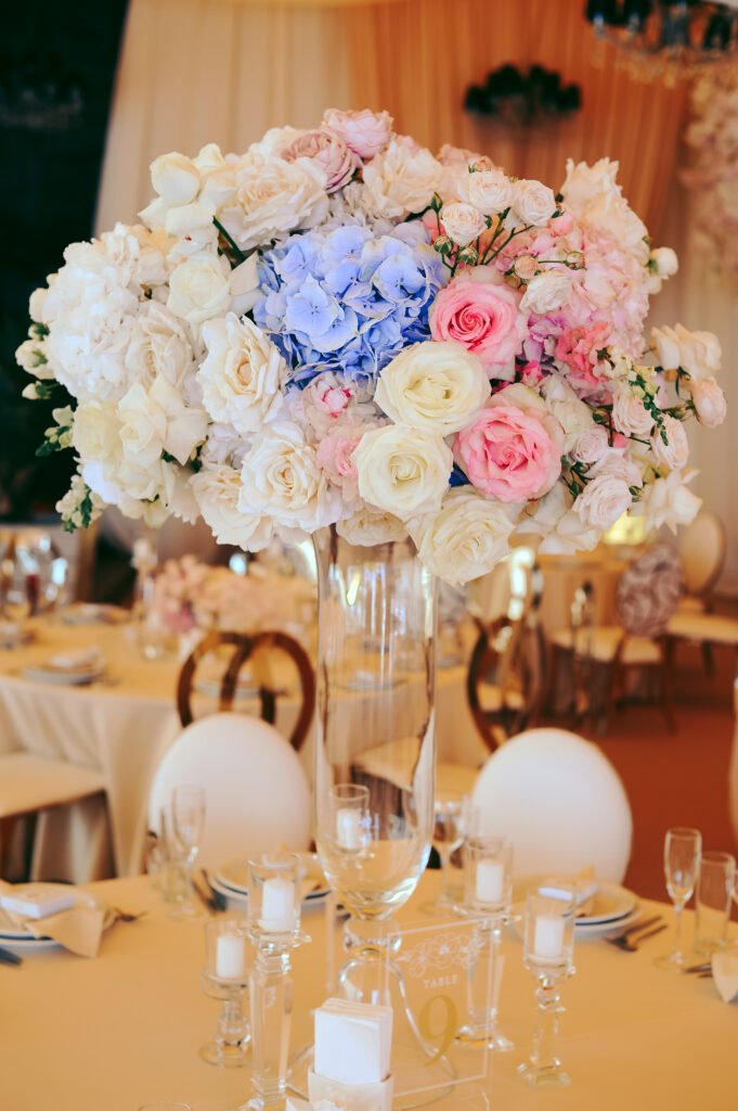 beautiful decorated centerpiece table with hydrangea bouquets in vases and greenery at luxury wedding reception in restaurant. stylish decor and adorning