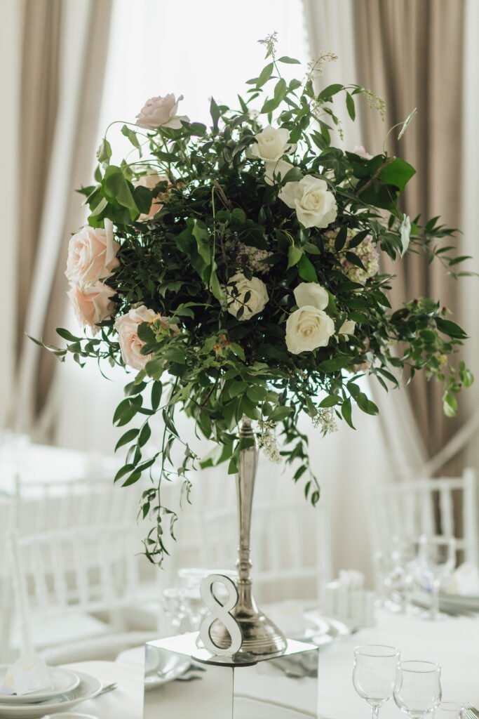 flower centerpiece bouquets with white and pink eustomas in the glass vases on the table