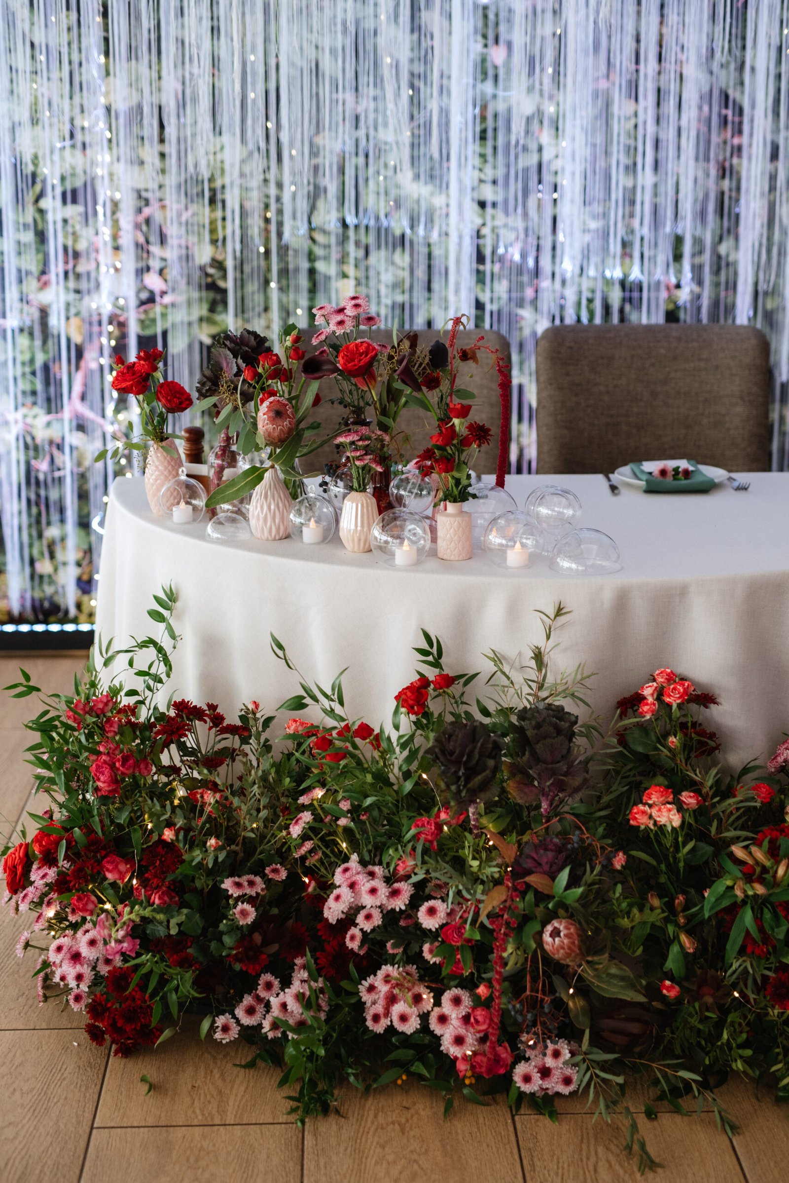 The presidium of the newlyweds in the banquet hall of the restaurant is decorated with candles and green plants, wisteria hangs from the ceiling