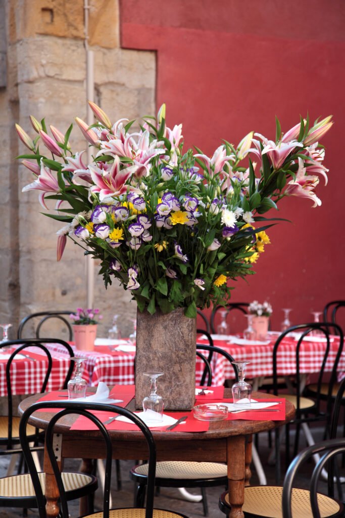 Typical French restaurant scene of tables and chairs with flower arrangement