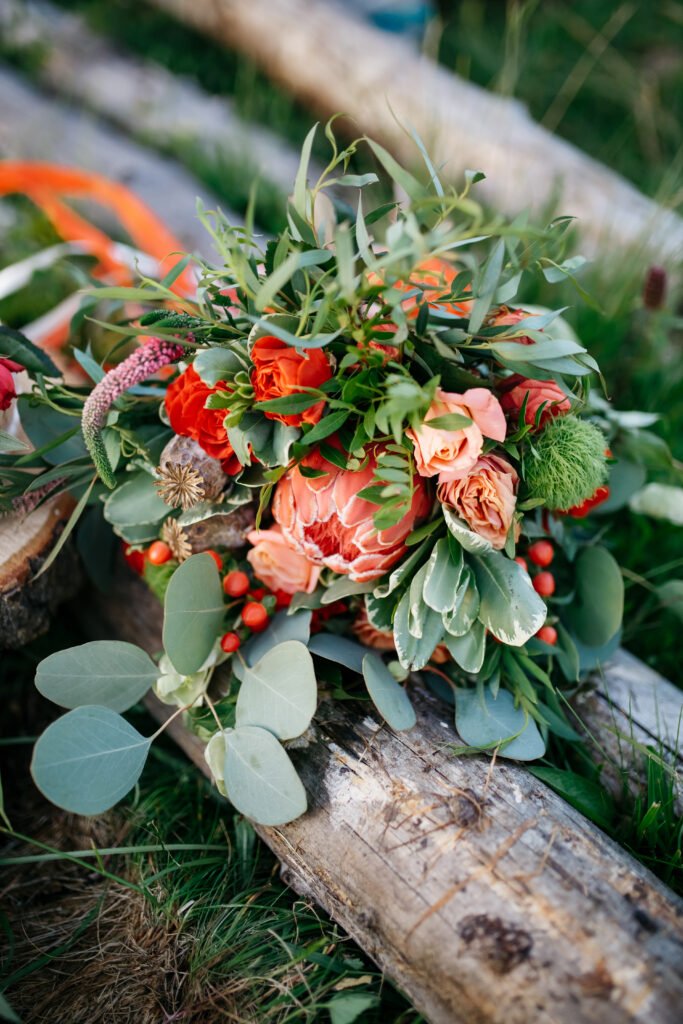 Stunning wedding bouquet made of red flowers and greenery lies over the block